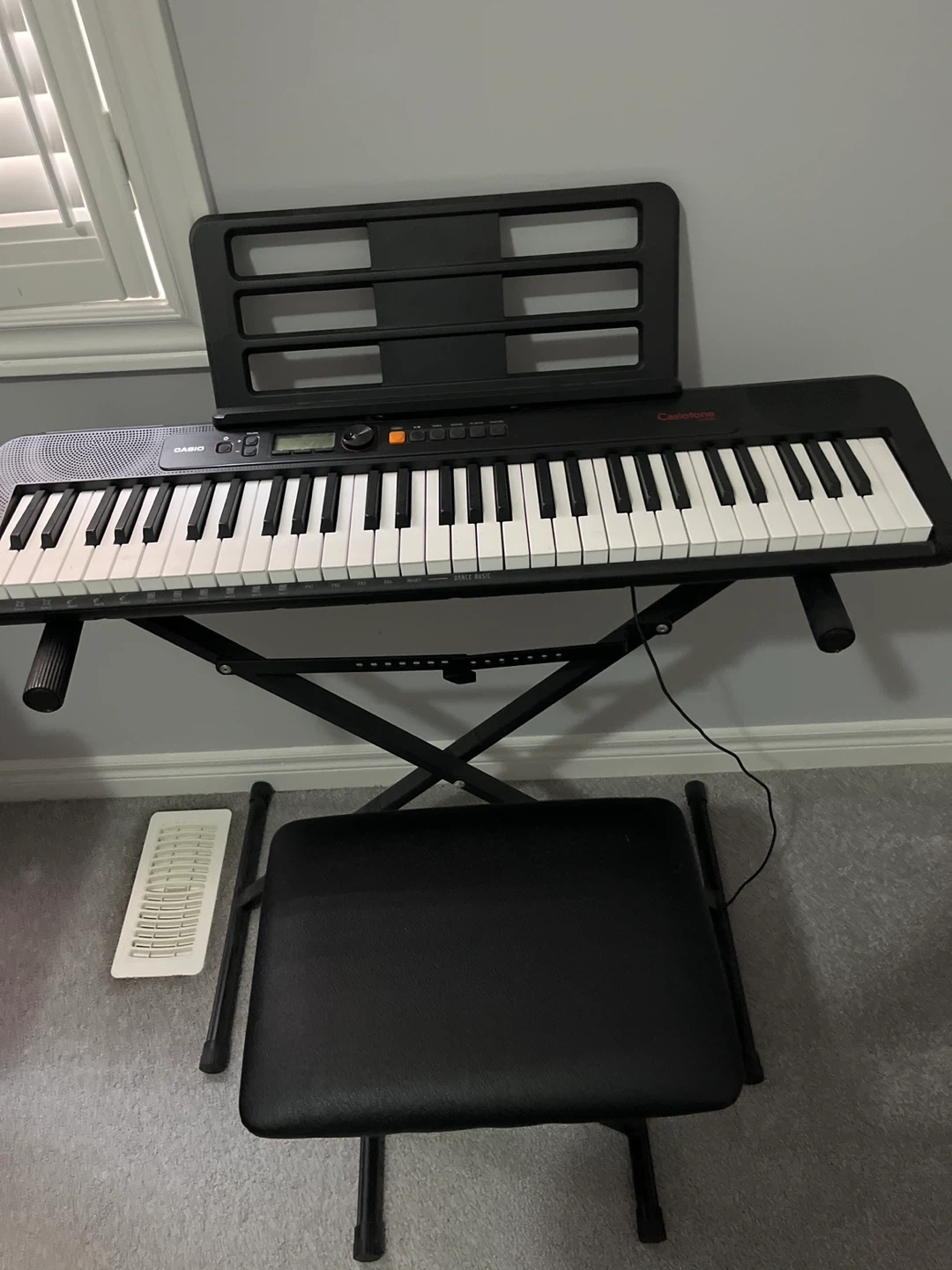 This Casio Casiotone CT-S195 portable keyboard comes with a music stand and a padded bench. It's a great starter keyboard for aspiring musicians. The keyboard features 61 keys and various tones and rhythms.