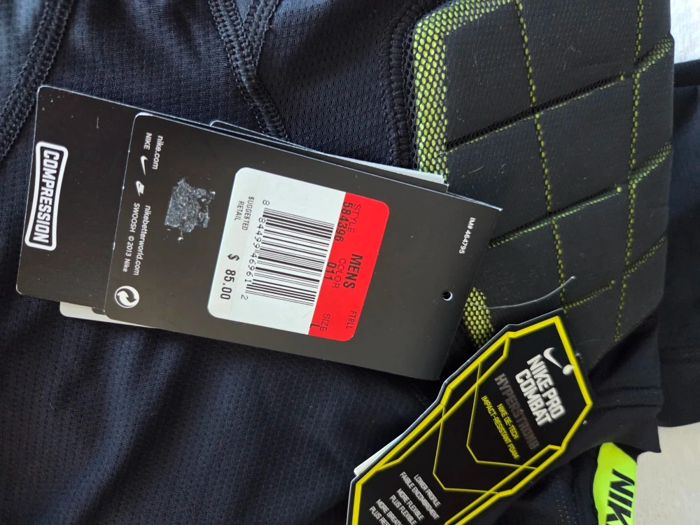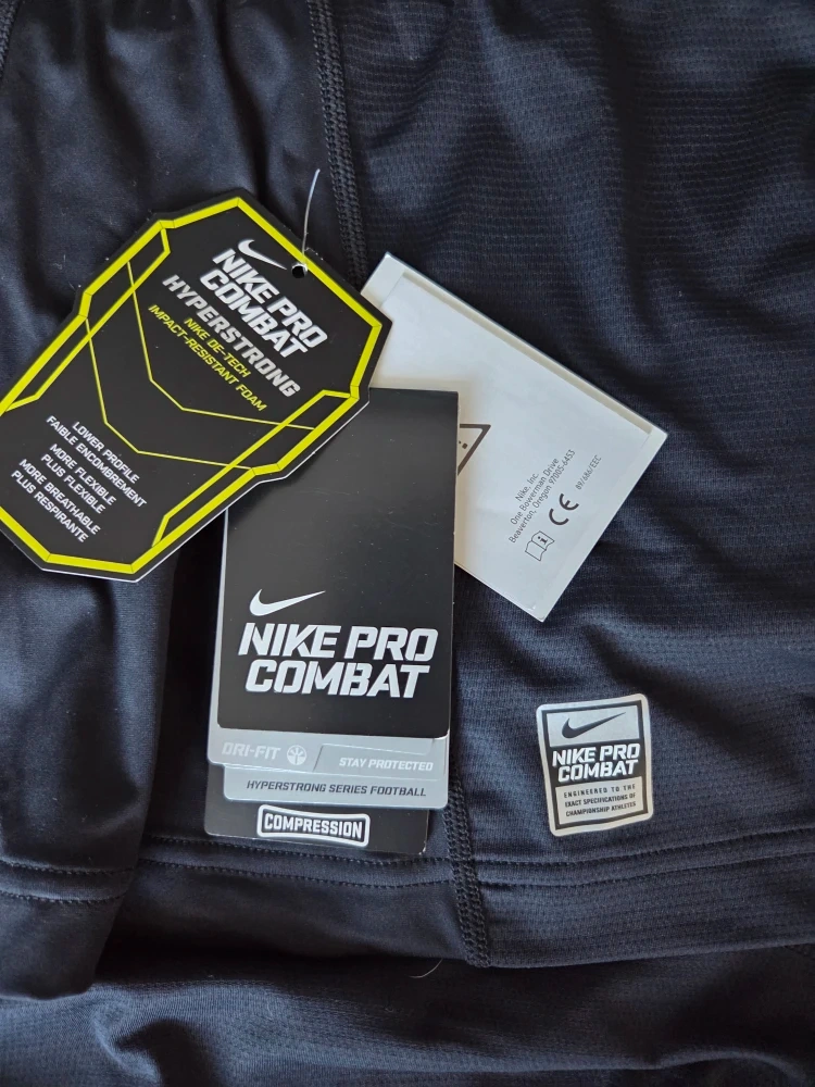 This is a Nike Pro Combat Hyperstrong series football shirt. It's a compression fit with impact-resistant foam padding. The shirt is made with Nike's Dri-Fit technology to stay dry. It's designed for enhanced flexibility and breathability.