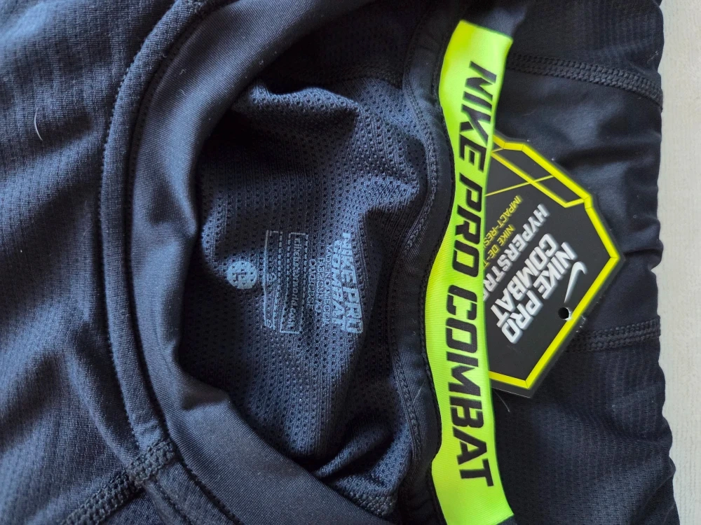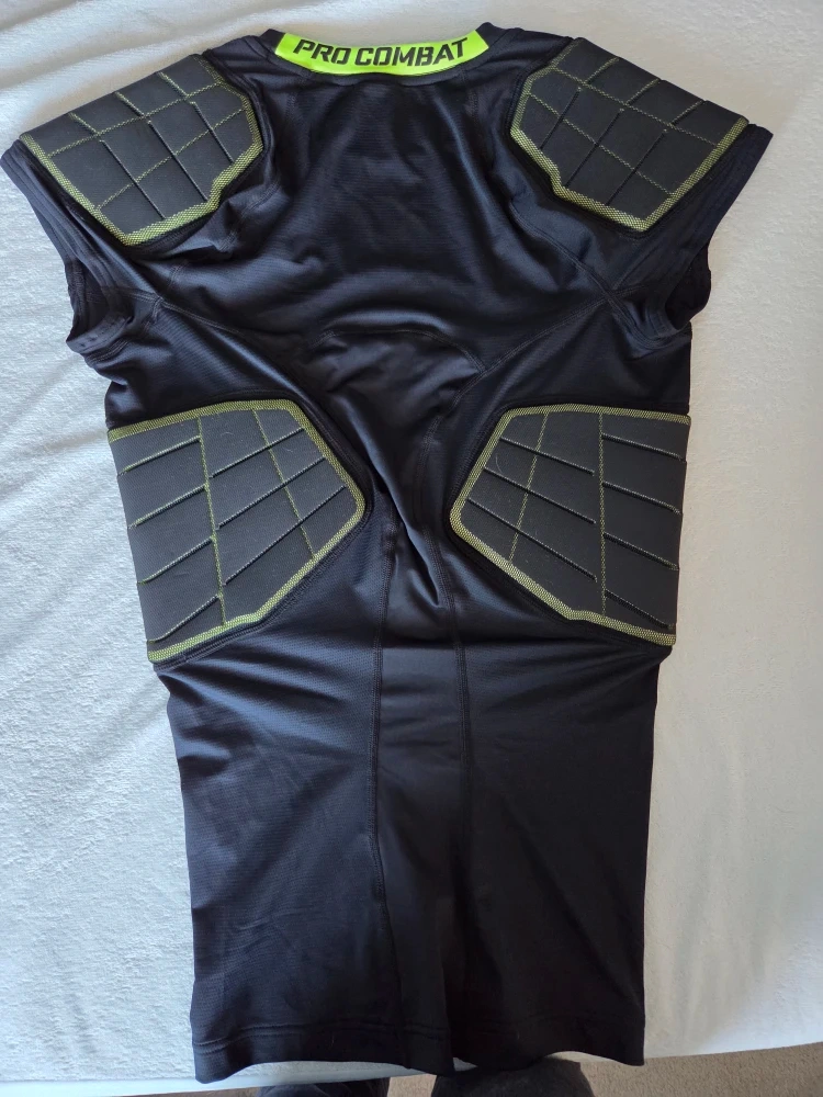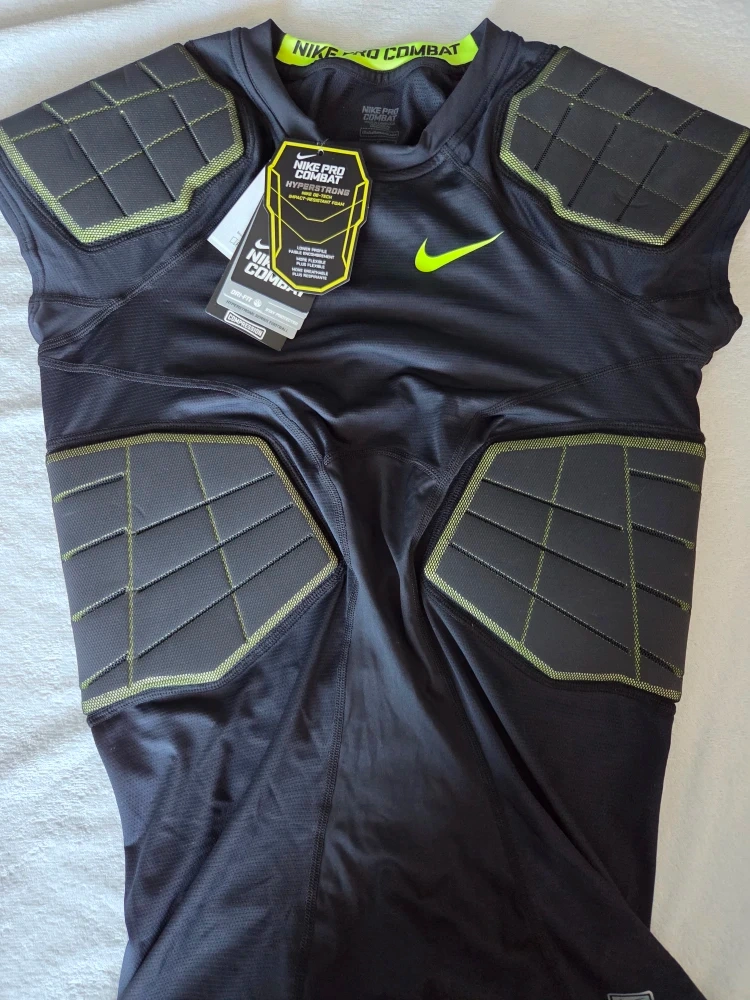 This is a Nike Pro Combat Hyperstrong series football shirt. It's a compression fit with impact-resistant foam padding. The shirt is made with Nike's Dri-Fit technology to stay dry. It's designed for enhanced flexibility and breathability.