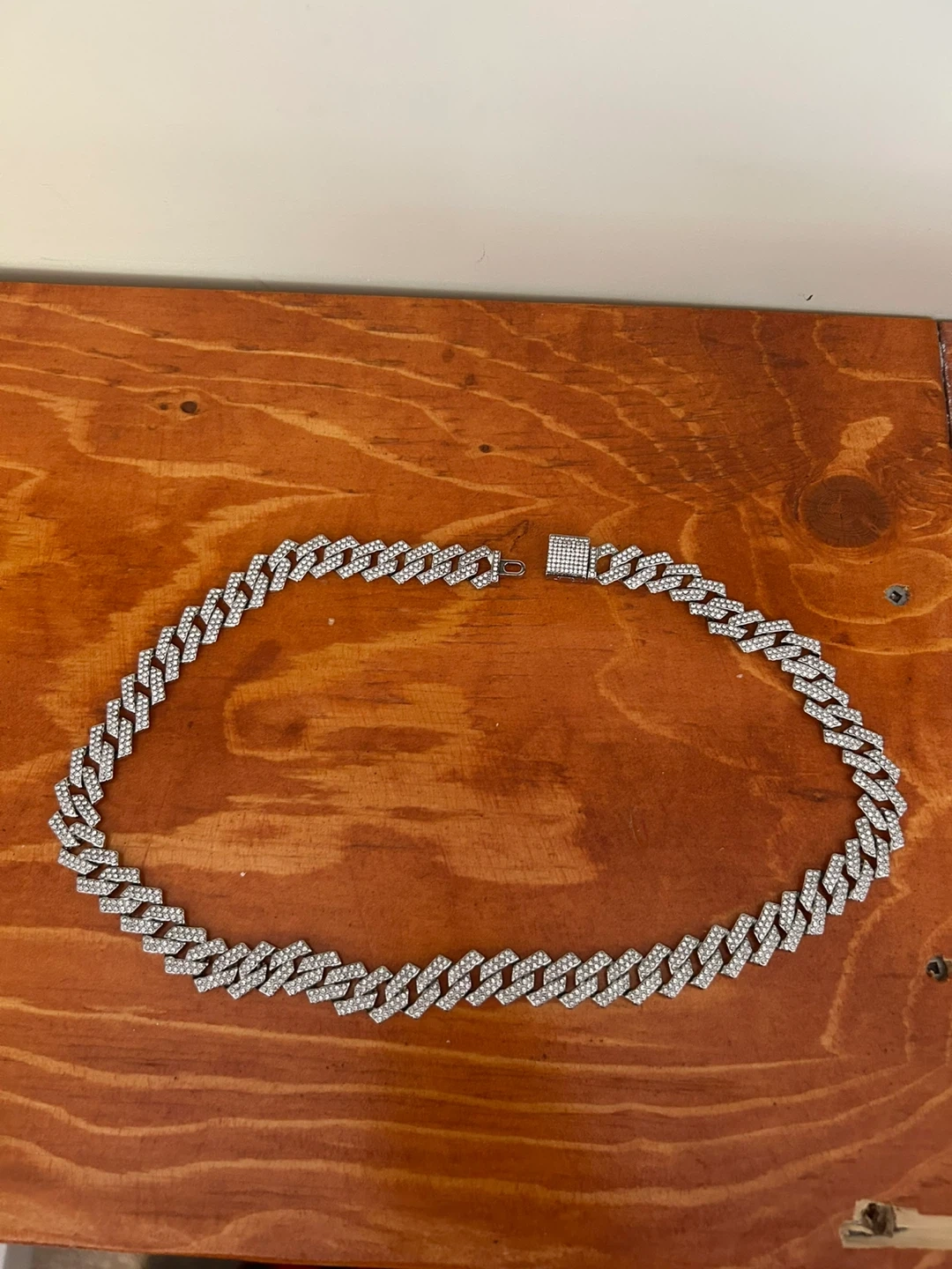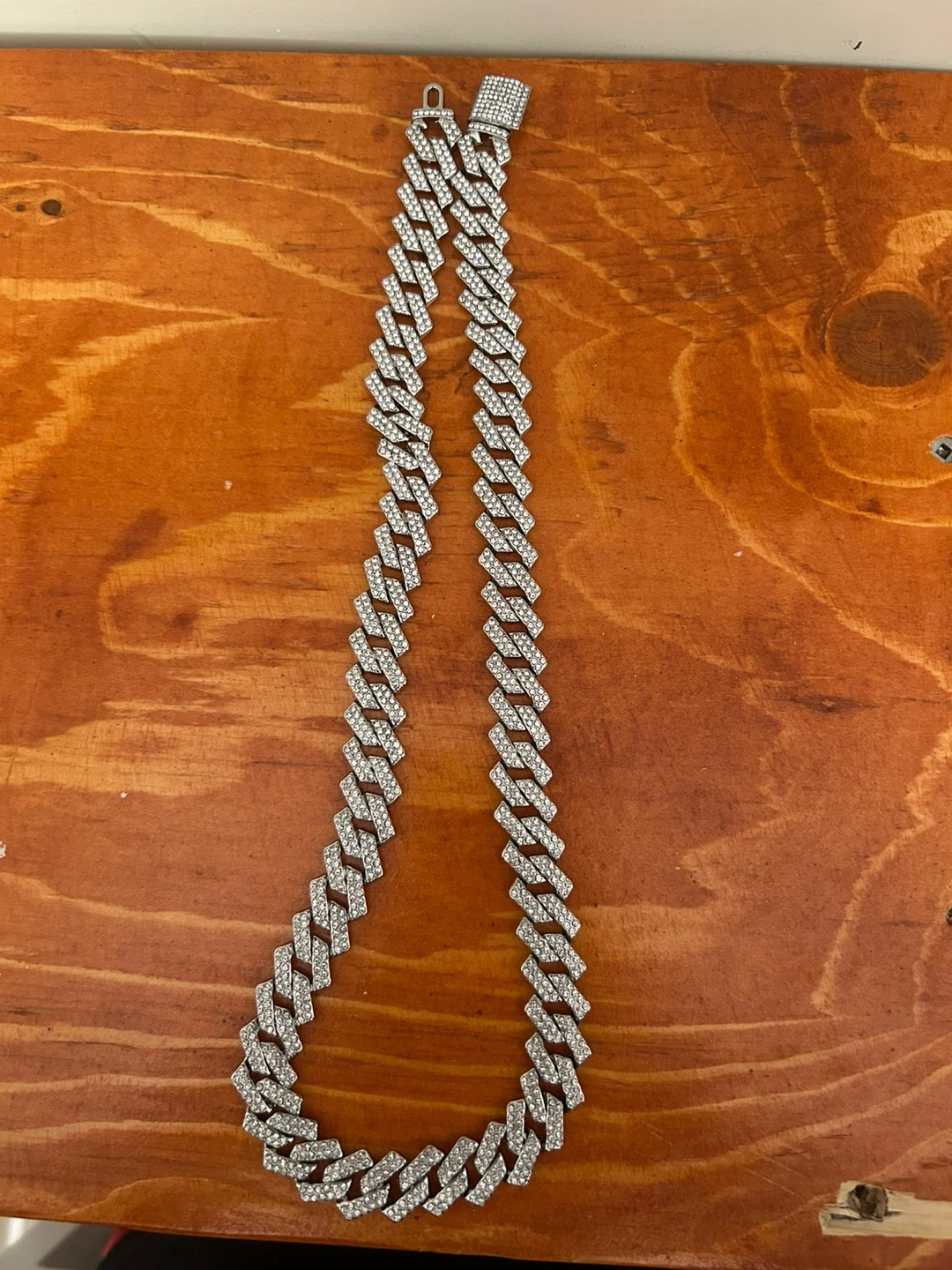 This is a striking Cuban link chain necklace encrusted with small clear stones. It features a secure clasp closure. It's a bold statement piece for any jewellery collection.