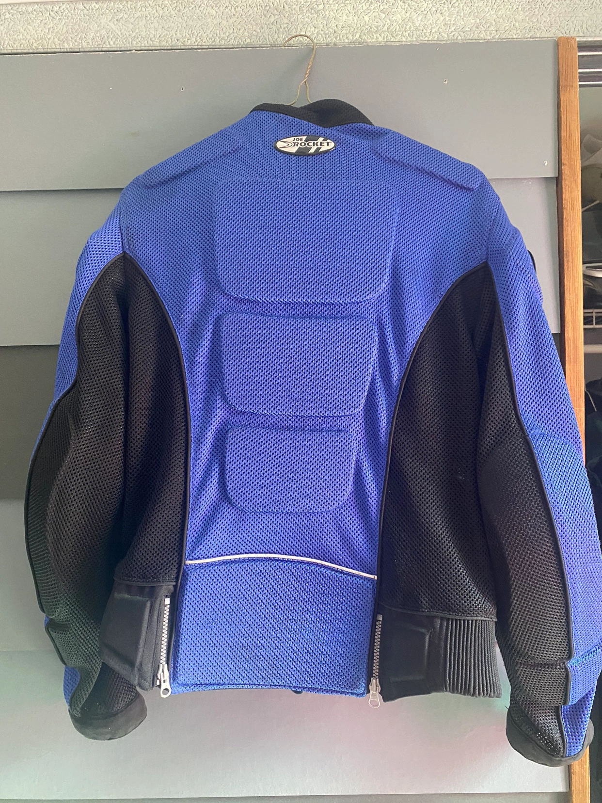 Blue and black Joe rocket motorcycle jacket with armour. It features a mesh design for ventilation and has a zipper closure. It has a removable liner and pockets. It is in good condition.