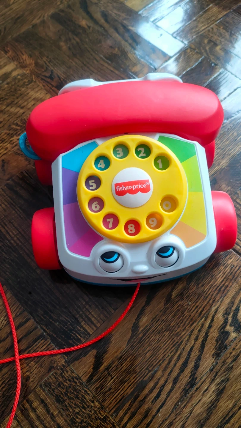 This is a classic Fisher-Price Chatter Telephone. It's a pull-along toy with a spinning dial and a phone receiver. Its bright colours make it engaging for little ones. This toy is great for toddlers learning to walk and develop fine motor skills.