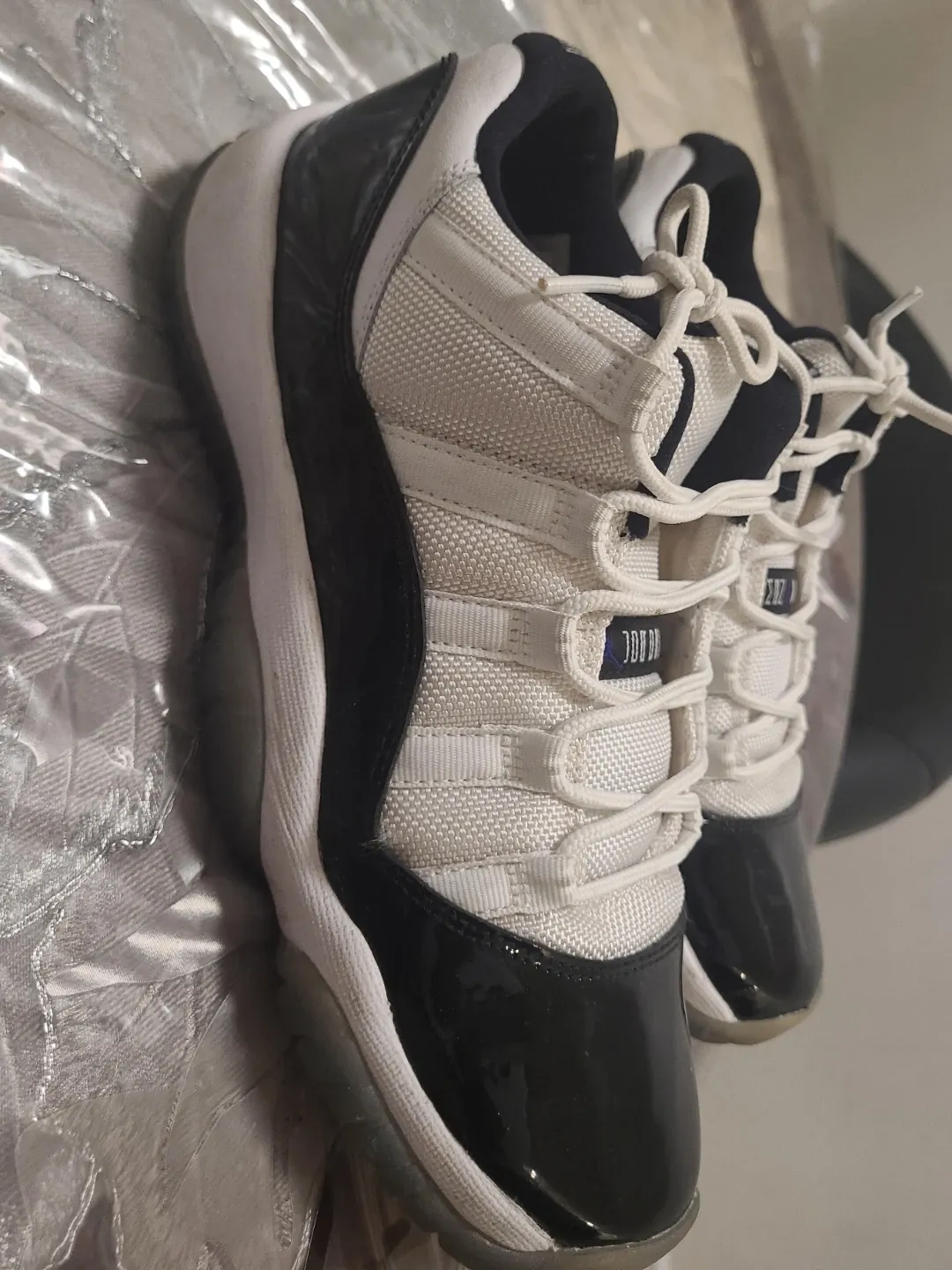 Classic Air Jordan 11 Retro Low sneakers in a white and black "Concord" colourway. They feature a mesh and patent leather upper with a rubber sole. These are a size 10 men's.
