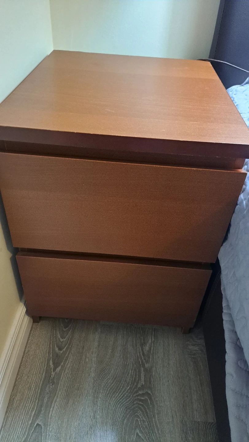 Selling two Ikea 2-drawer nightstand with a wood-look finish. It's perfect for keeping essentials handy next to your bed. Some minor wear is visible on the top edge.