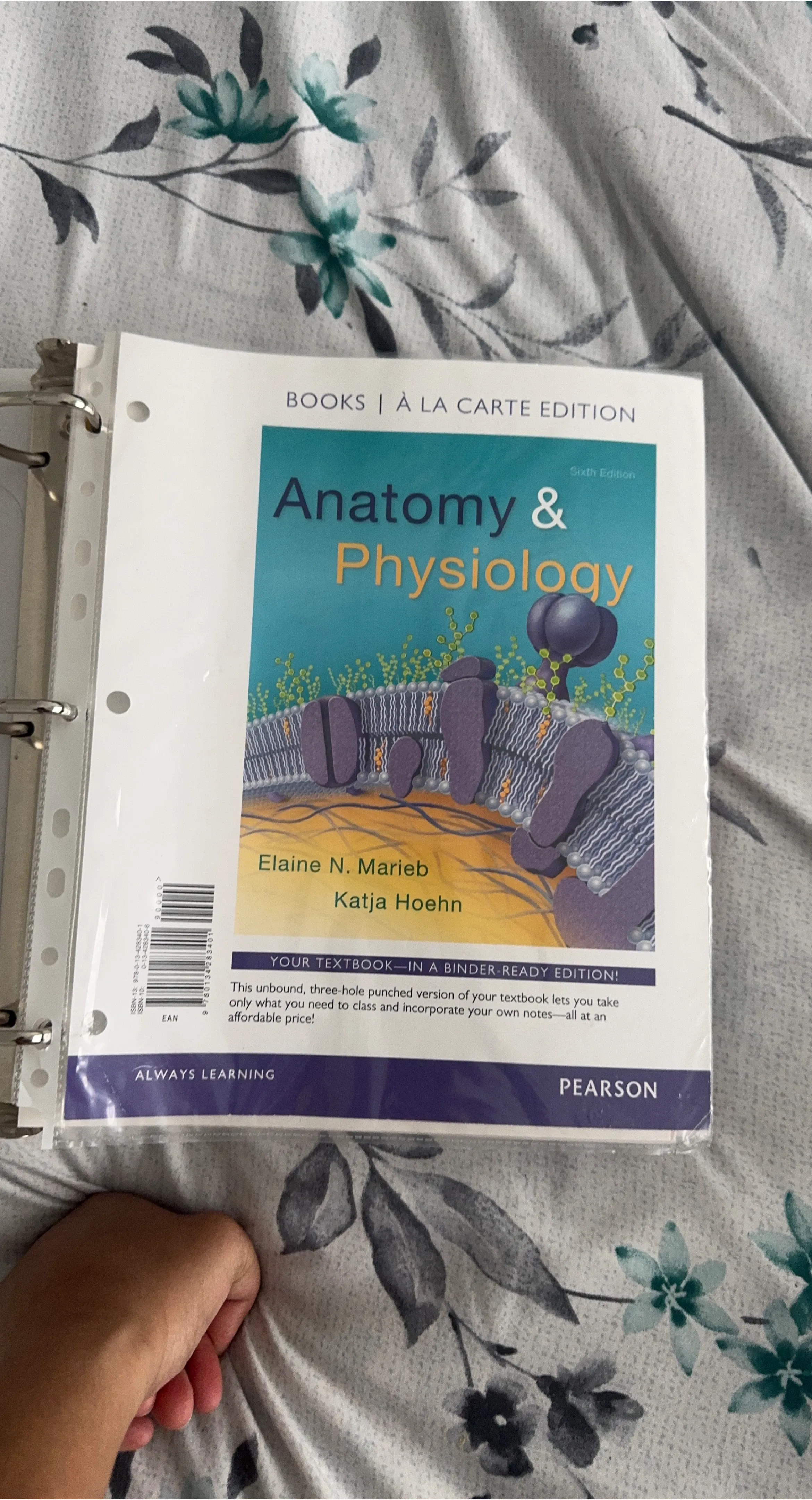 This is a three-hole punched, unbound version of the textbook 'Anatomy & Physiology' by Elaine N. Marieb and Katja Hoehn. It is the Sixth Edition, published by Pearson. It's a binder-ready format for easy note-taking alongside readings.