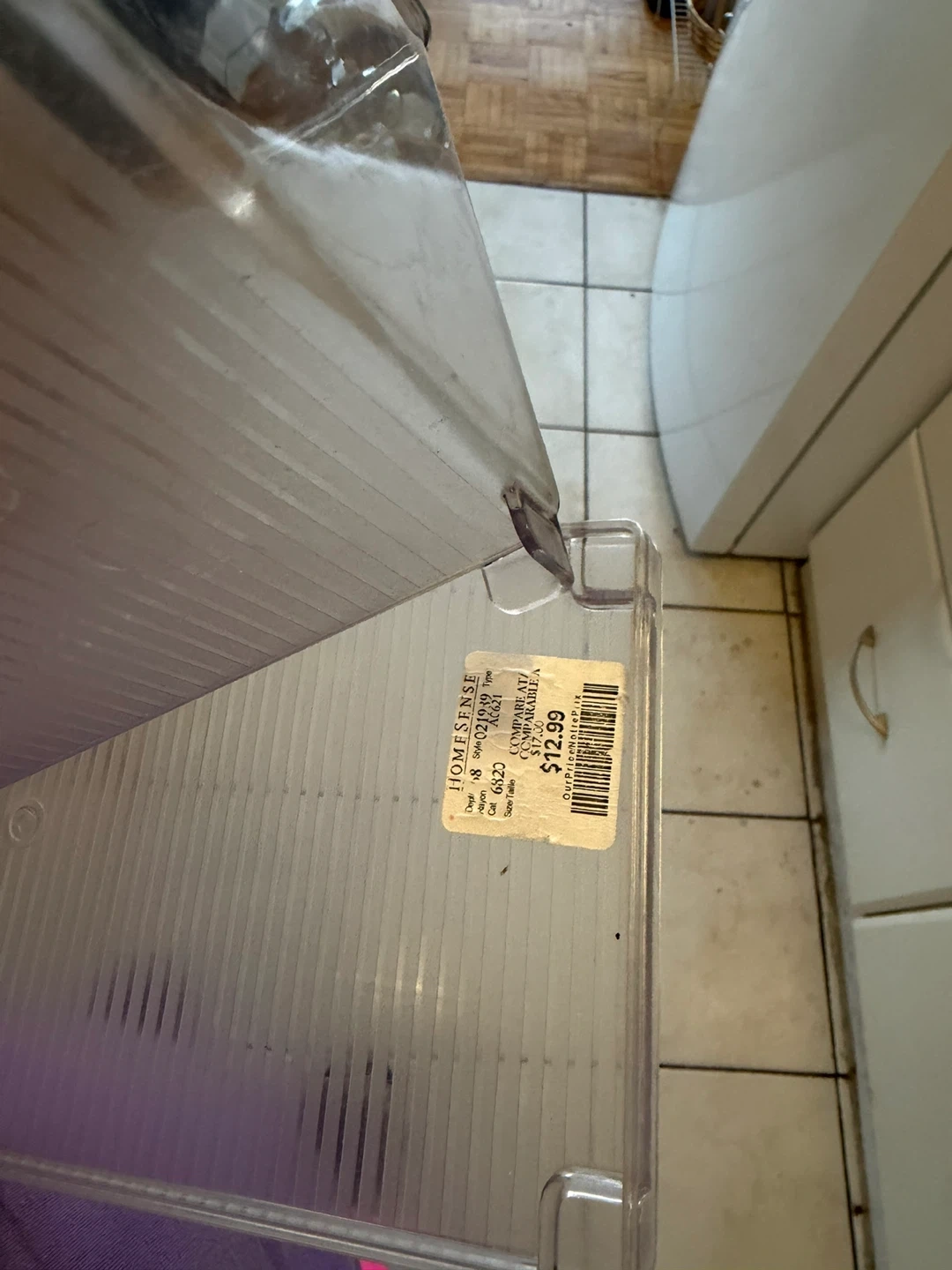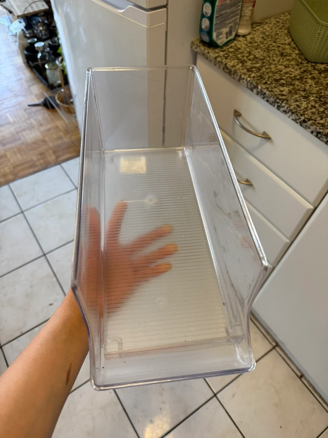 Clear storage bin for refrigerators. Made of durable plastic. It's approximately 12 inches long by 6 inches wide by 6 inches high. Keeps your fridge organized!