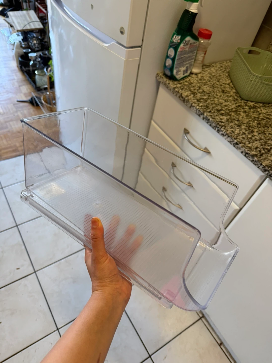 Clear storage bin for refrigerators. Made of durable plastic. It's approximately 12 inches long by 6 inches wide by 6 inches high. Keeps your fridge organized!