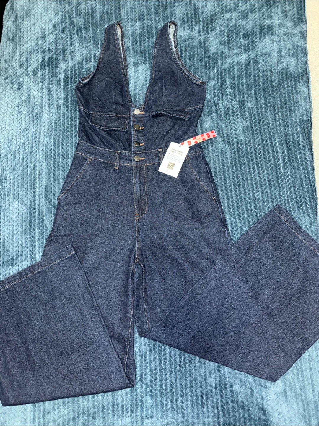 This is a Cider dark navy denim jumpsuit in size medium. It is in great condition and ready for a new owner!