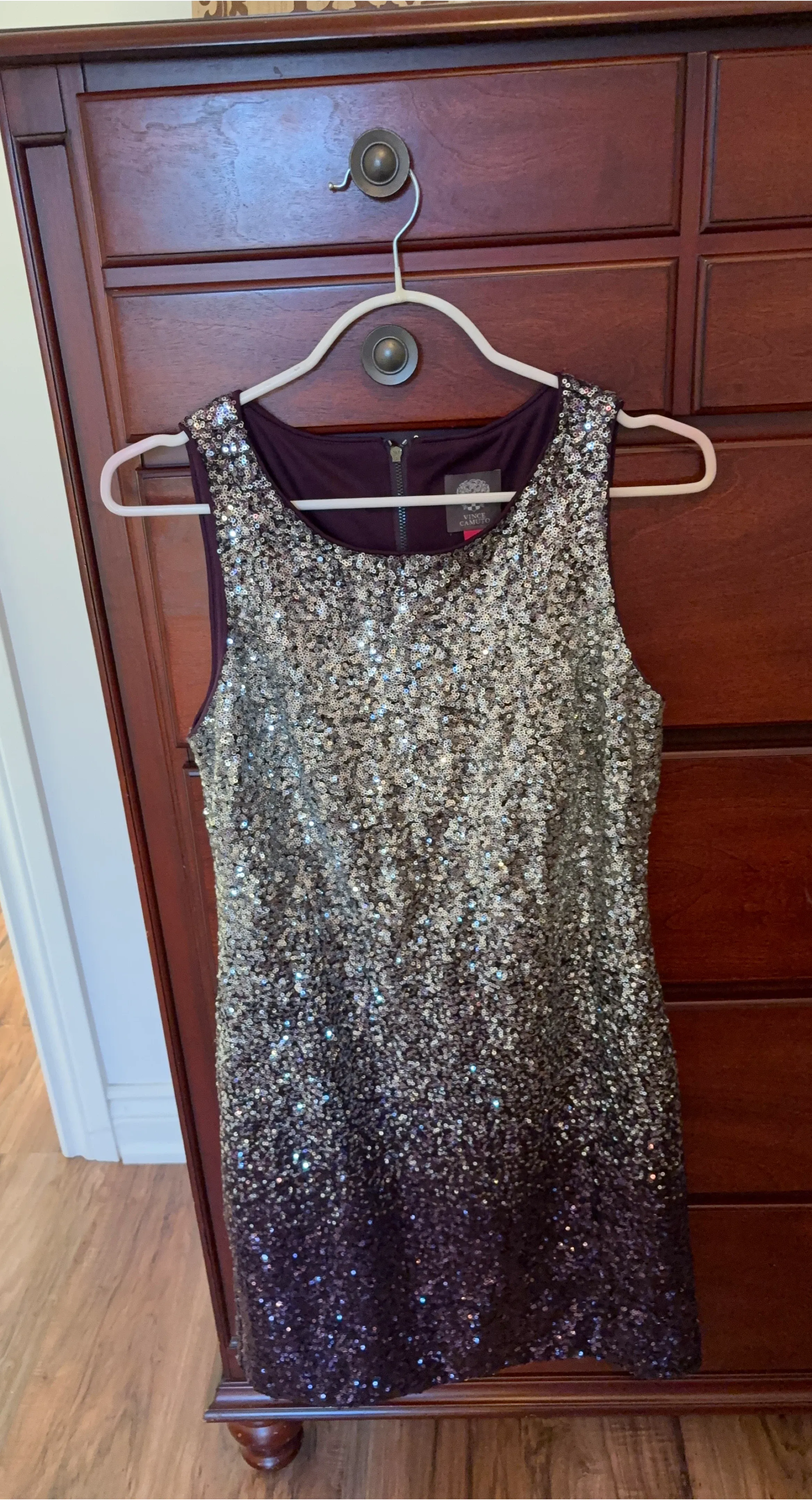Sparkly sequin sleeveless dress with a purple lining. It's a beautiful statement piece for any special occasion! The sequins go from silver to dark purple.
