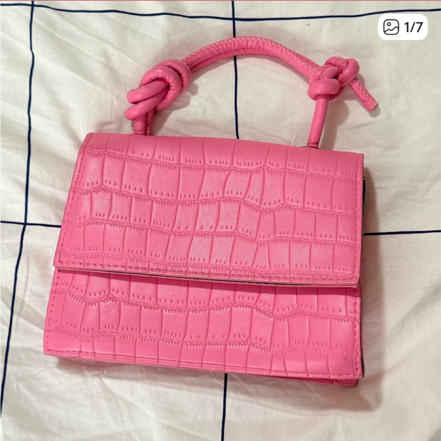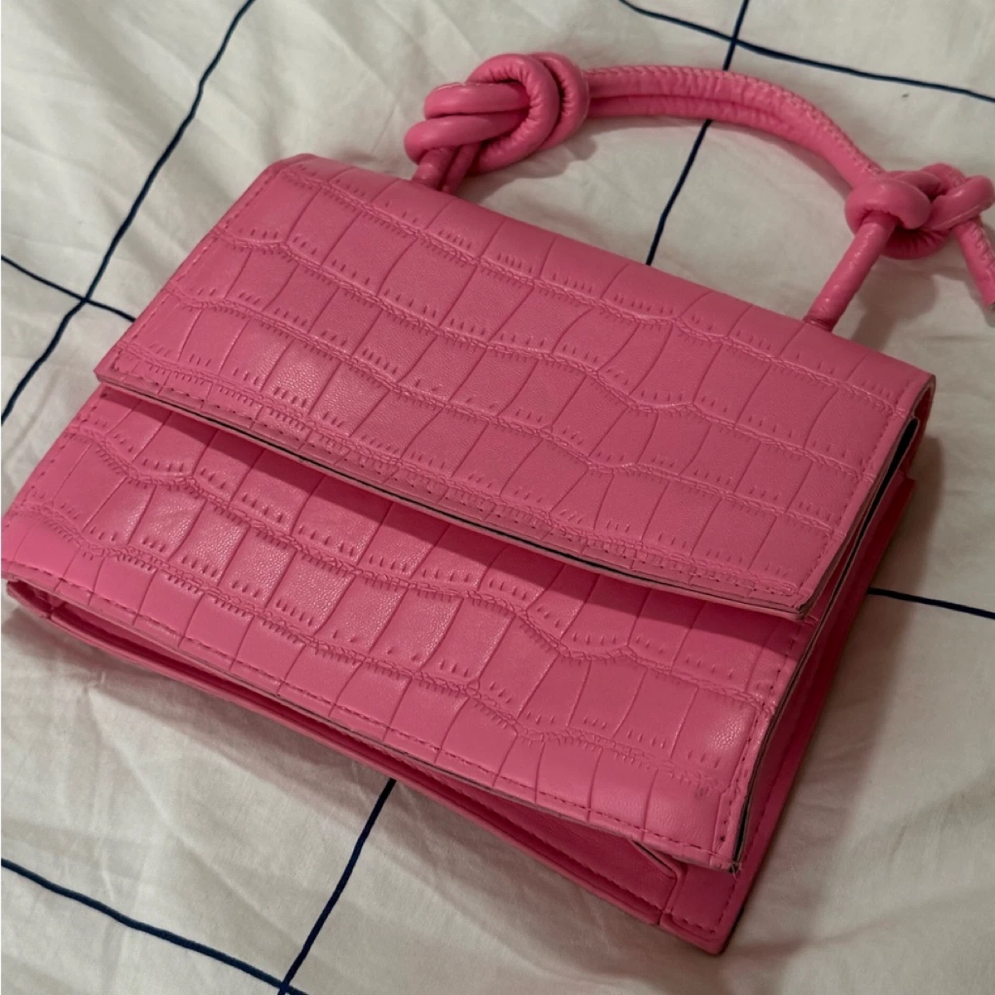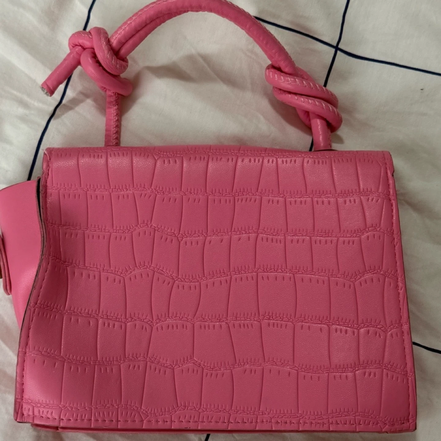This adorable pink mini bag is perfect for adding a pop of colour to any outfit! It features a unique top handle with knotted detailing and a faux crocodile leather texture. The bag is in great condition and ready for a new owner!