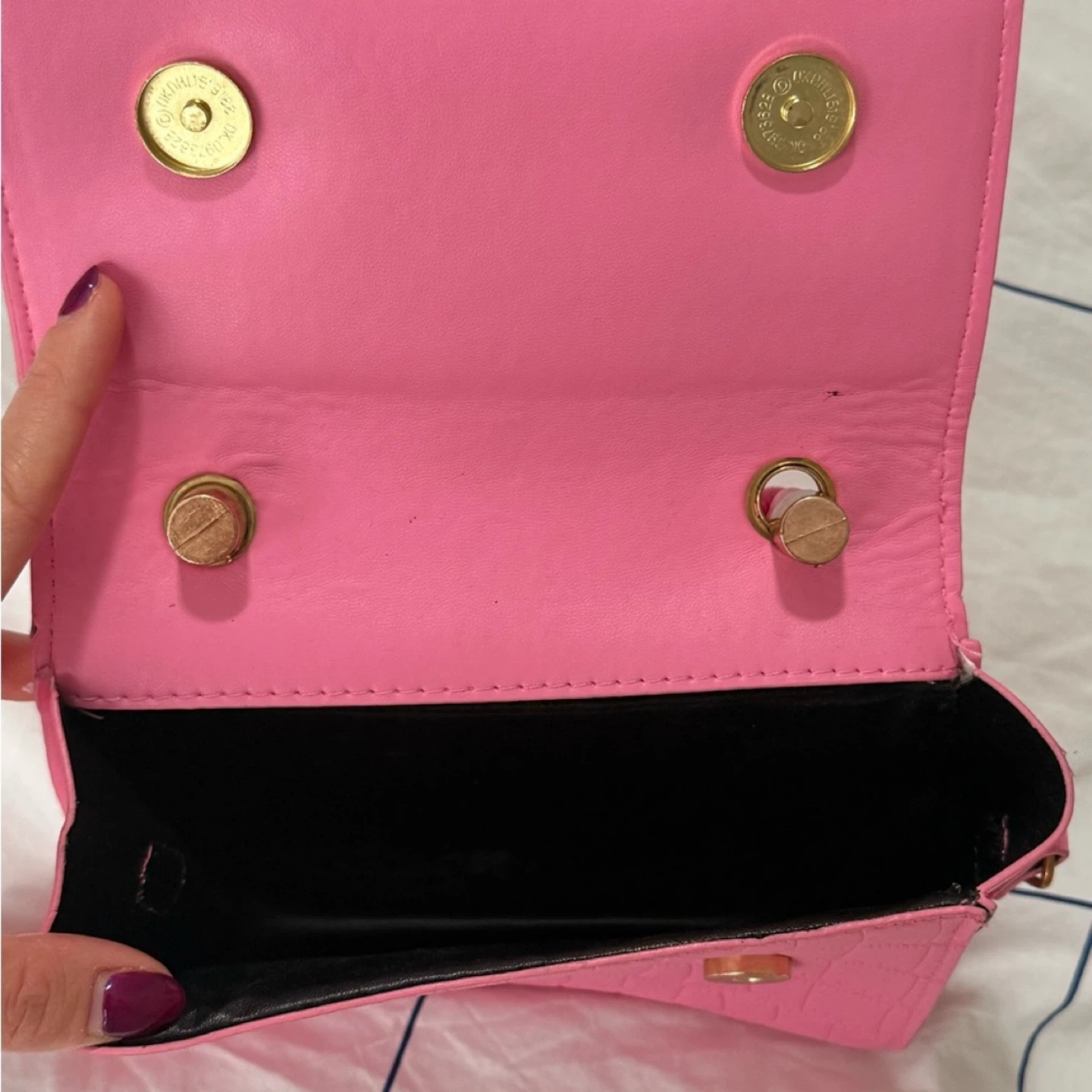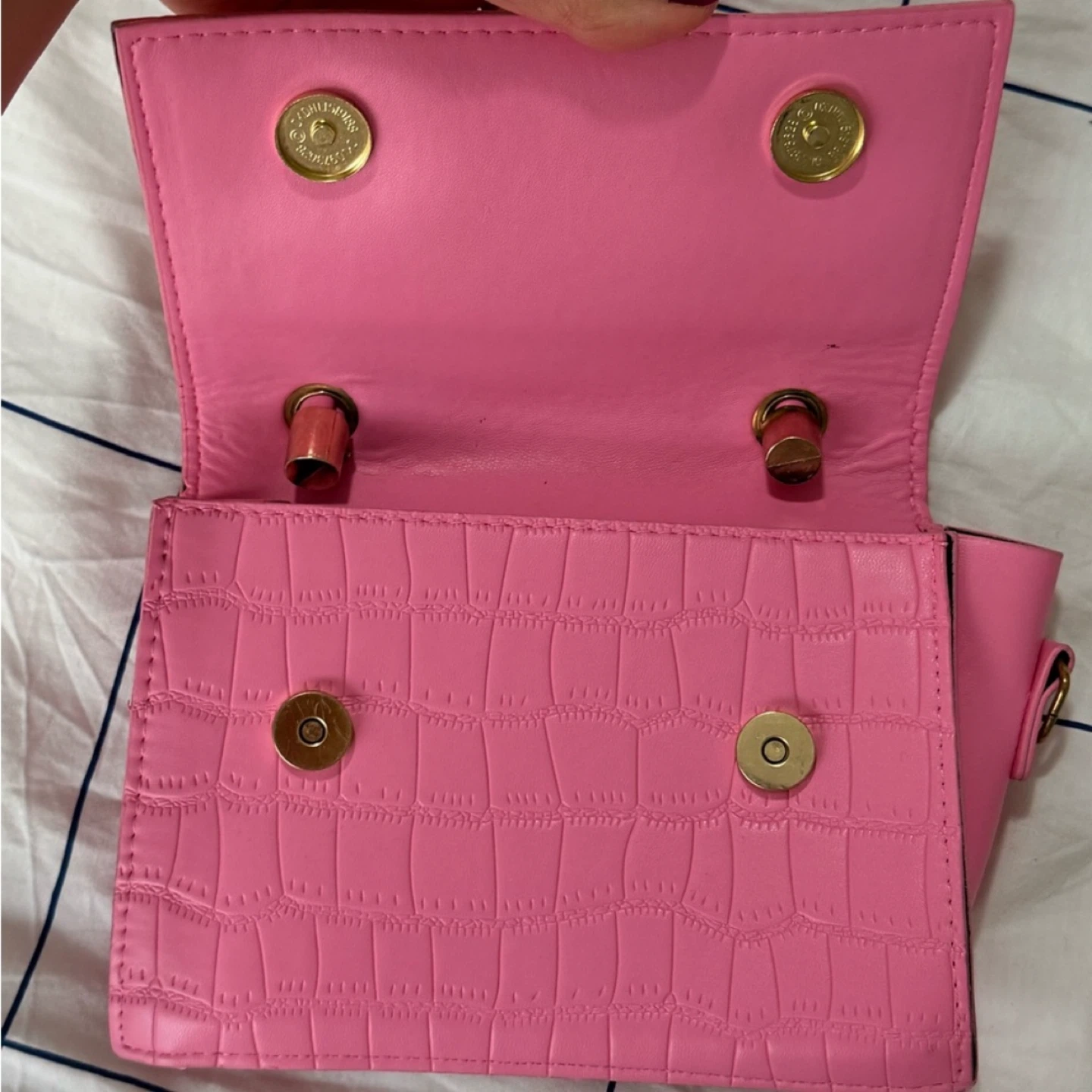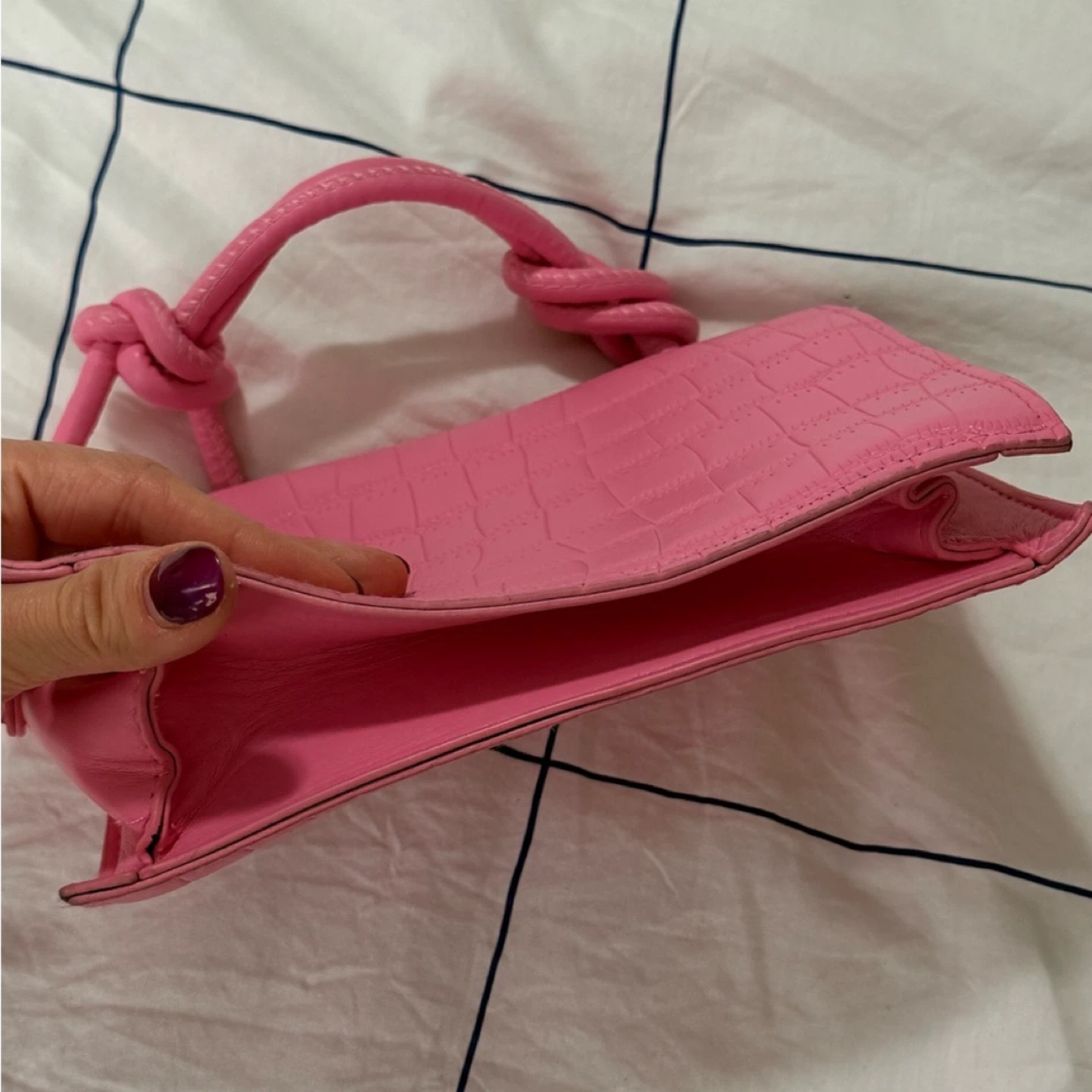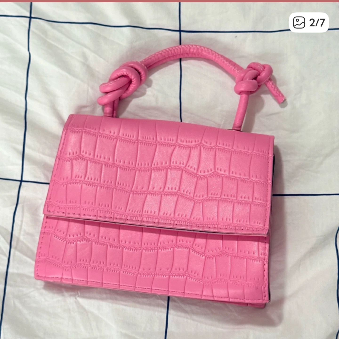 This adorable pink mini bag is perfect for adding a pop of colour to any outfit! It features a unique top handle with knotted detailing and a faux crocodile leather texture. The bag is in great condition and ready for a new owner!