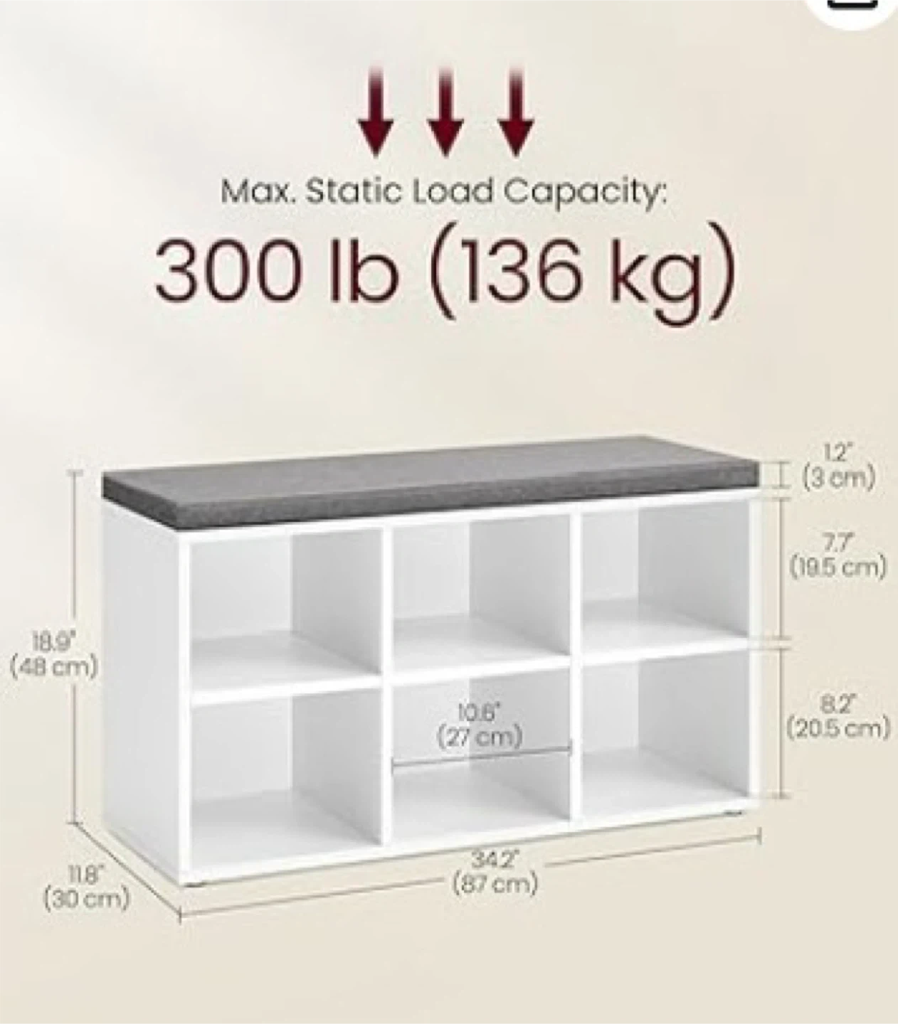 This white storage bench features a grey upholstered cushion top. It has six cube-shaped compartments for organization. The maximum static load capacity is 300 lb (136 kg).