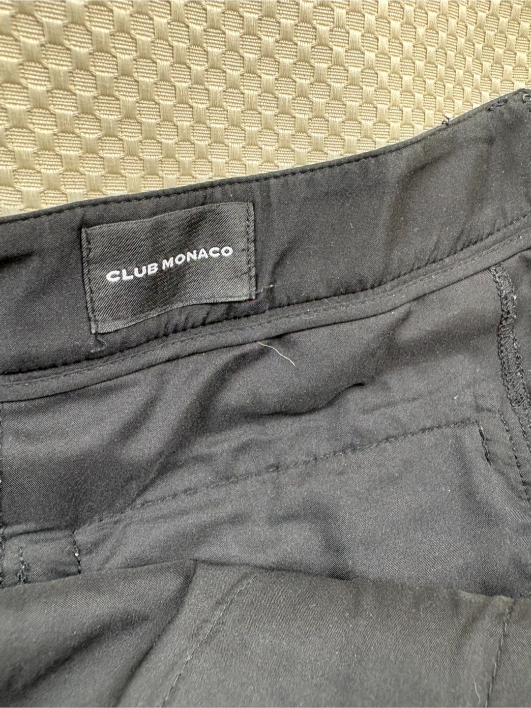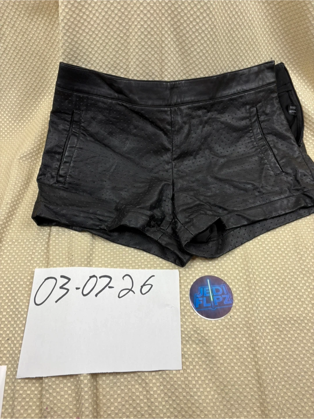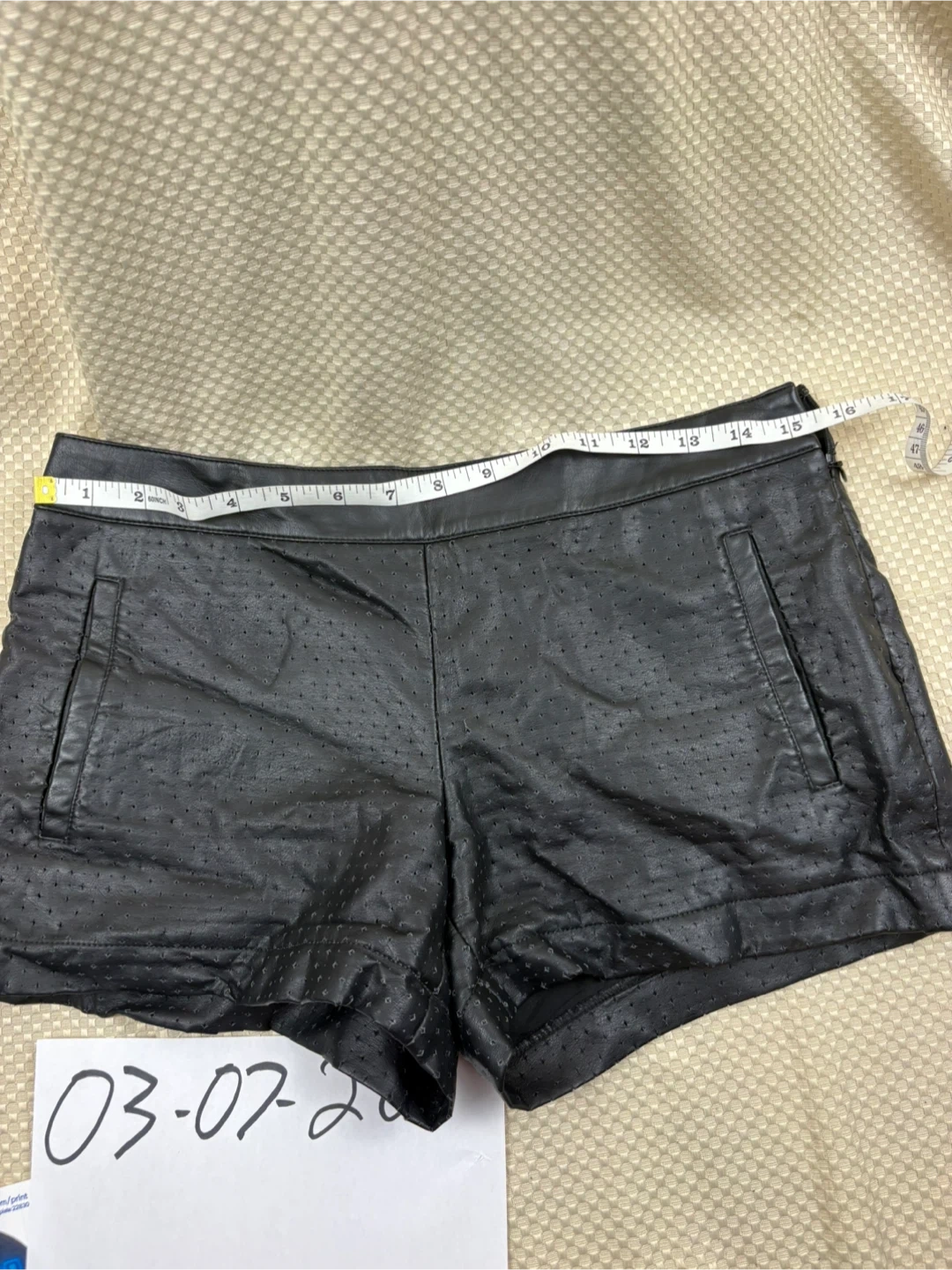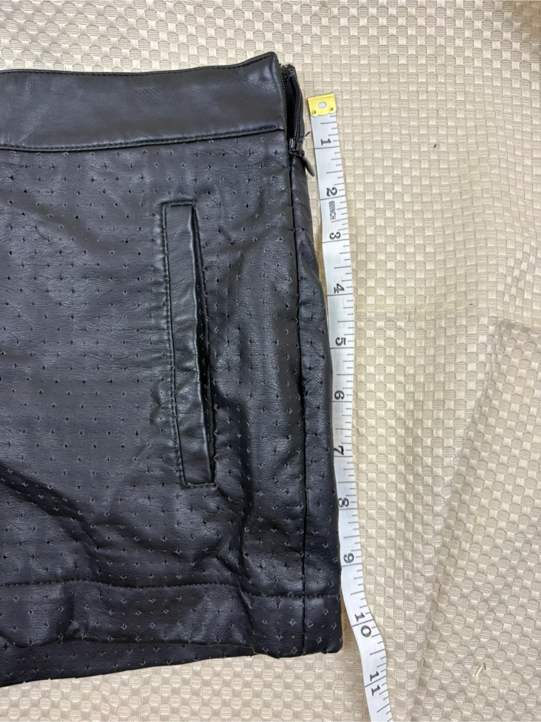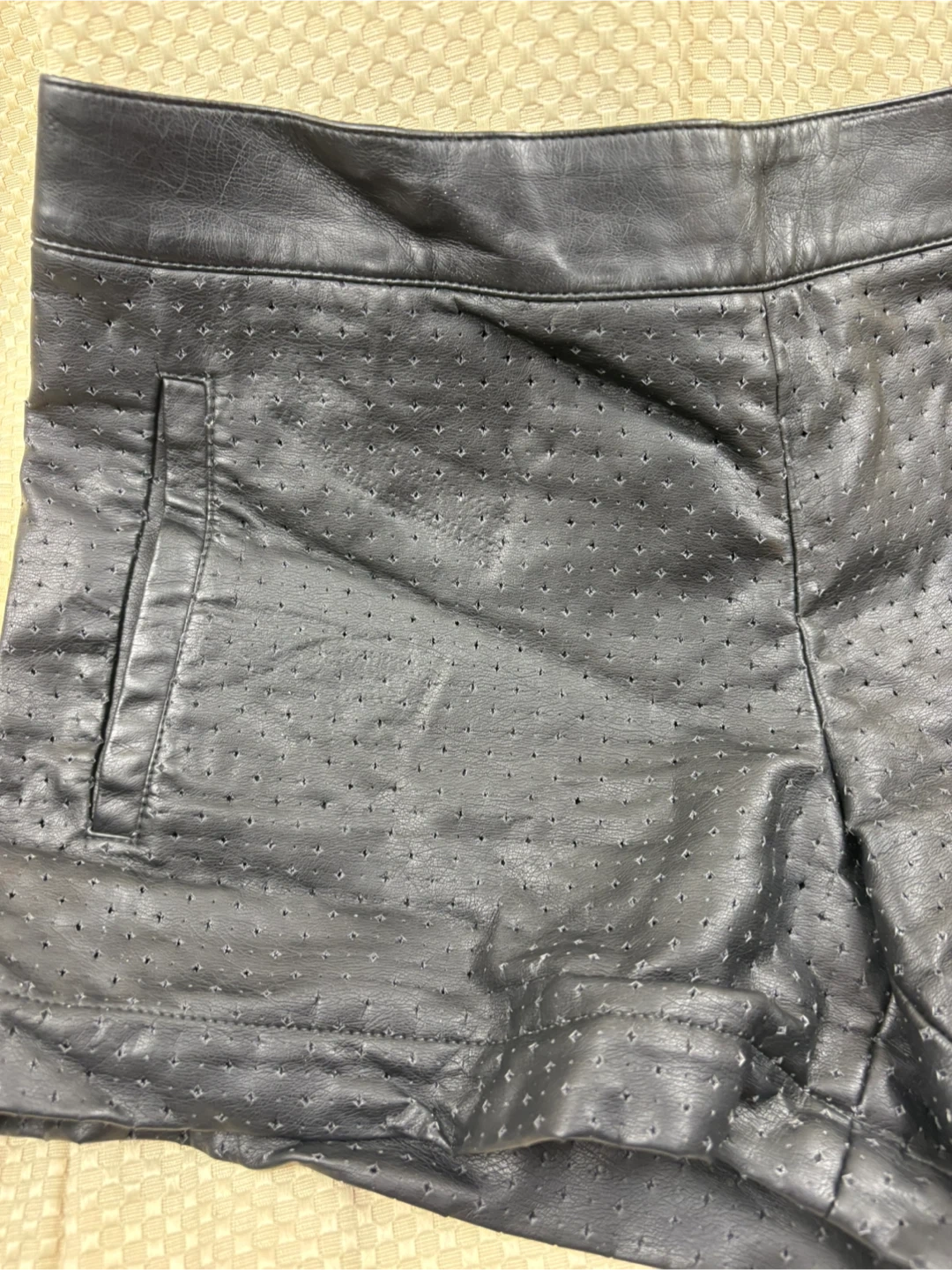 Club Monaco shorts in a faux leather material. They feature a perforated design throughout and a zipper closure. These shorts are black and have a modern look.
