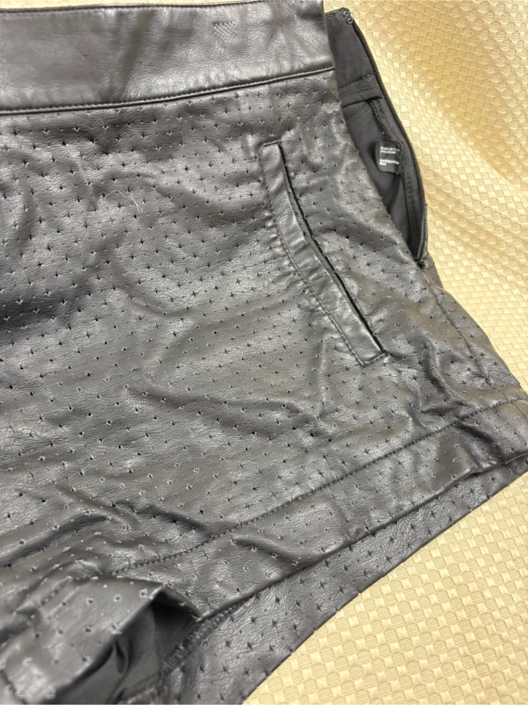 Club Monaco shorts in a faux leather material. They feature a perforated design throughout and a zipper closure. These shorts are black and have a modern look.