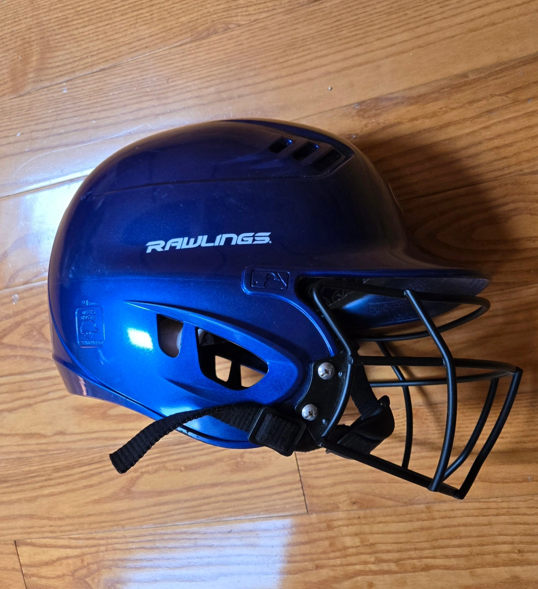 A blue baseball helmet. Equipped with a black face guard. It has a chin strap. Enjoy a day at the ballpark in this helmet for added protection.