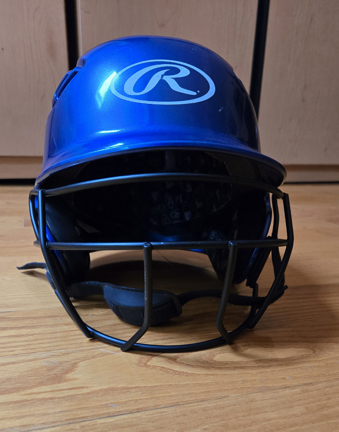 A blue baseball helmet. Equipped with a black face guard. It has a chin strap. Enjoy a day at the ballpark in this helmet for added protection.