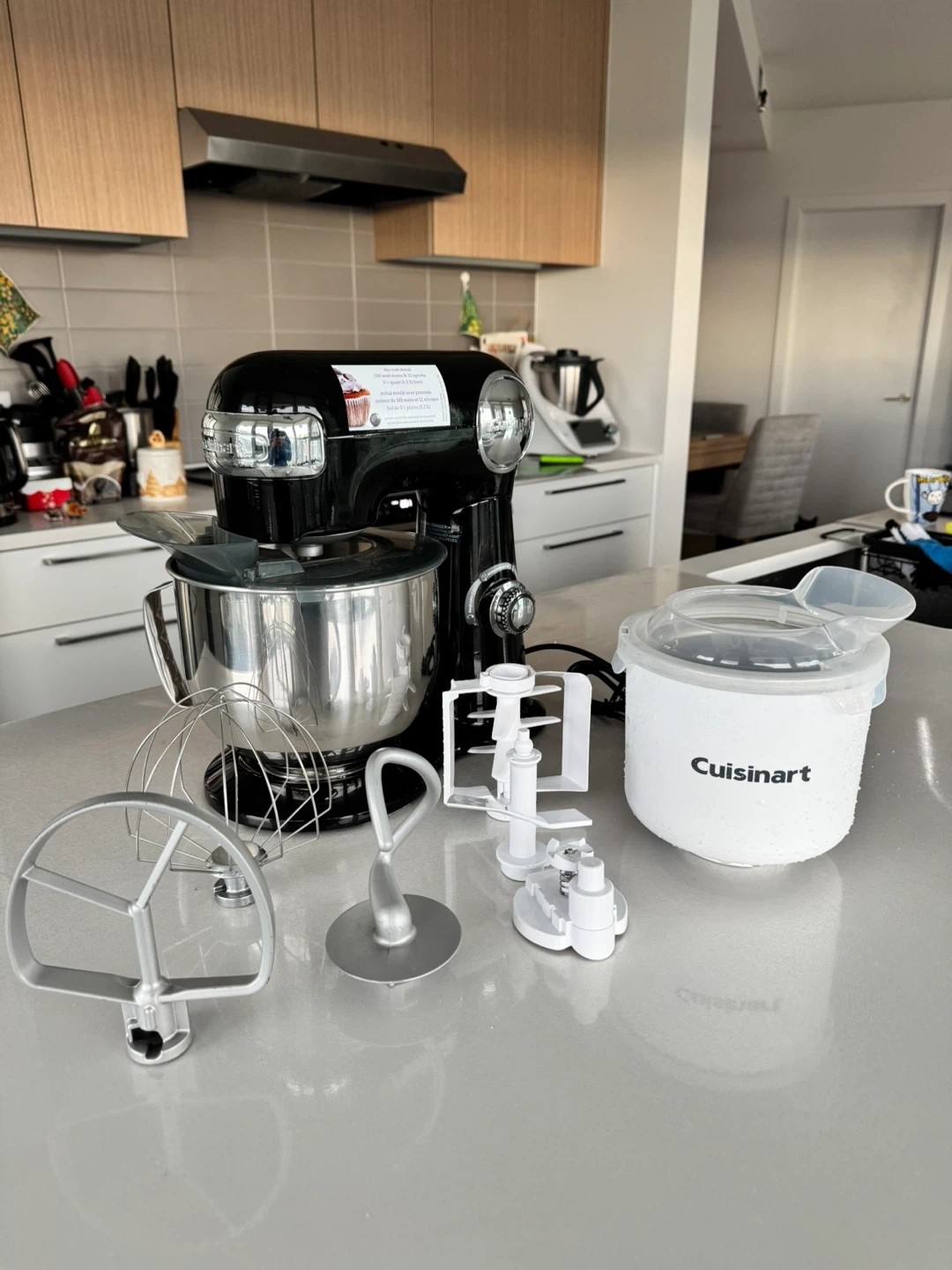 Selling a Cuisinart stand mixer in great condition! It comes with all the attachments you need for baking, including a whisk, dough hook, and flat beater. Plus, it includes an ice cream maker attachment for making homemade ice cream! Great for any baking enthusiast