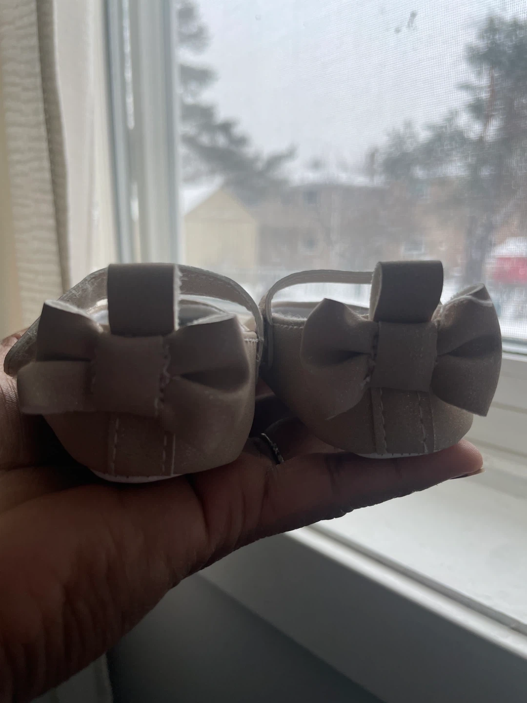 These adorable Carter's baby shoes are a size 0-3 months. They're a lovely neutral champagne colour with cute little bows on the back. Perfect for a newborn's first special occasion!