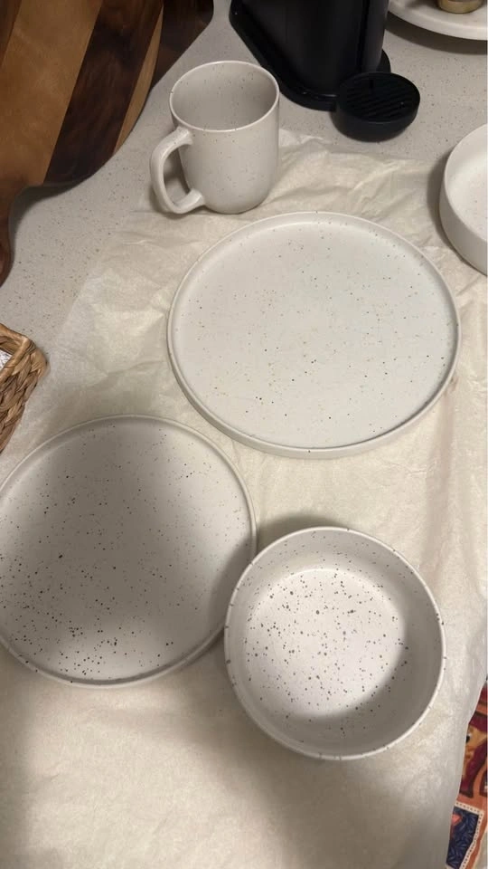 Stoneware. Set of 8 place settings. Paid over $600 for this entire set. Selling for $320 obo. 8 Small Bowl: 5.75"W x 5.75"D x 3"H. 8 Large Bowl: 8"W x 8"D x 2"H. 8 Side Plate: 8.50"W x 8.50"D x 0.75"H. 8 Dinner Plate: 10.75"W x 10.75"D x 0.75"H. 8 Mugs: 21 oz.