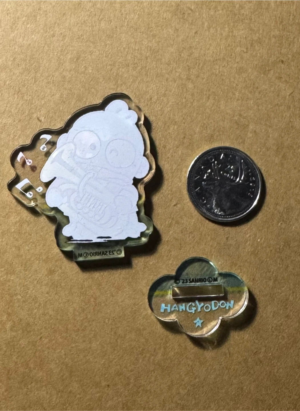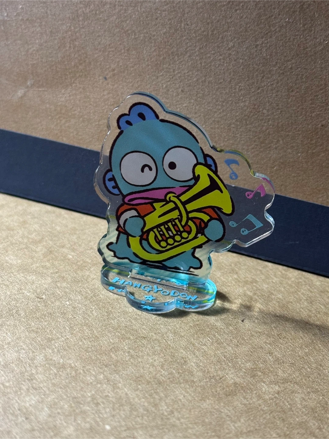 This is a Sanrio Hangyodon acrylic stand. It features the character playing a trumpet with musical notes. The stand is made of clear acrylic with colourful printing.