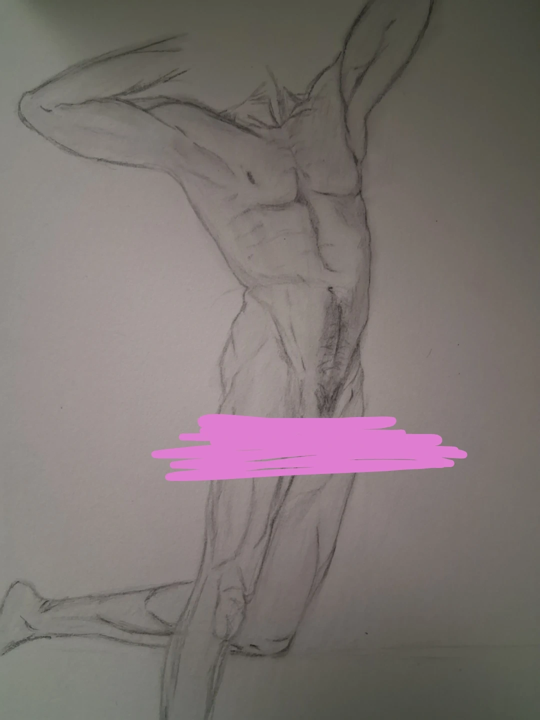 A detailed pencil sketch depicting a muscular male physique in a dynamic pose. The artwork showcases shading and line work to capture anatomical details. This piece is suitable for artists studying figure drawing or for decorative purposes.