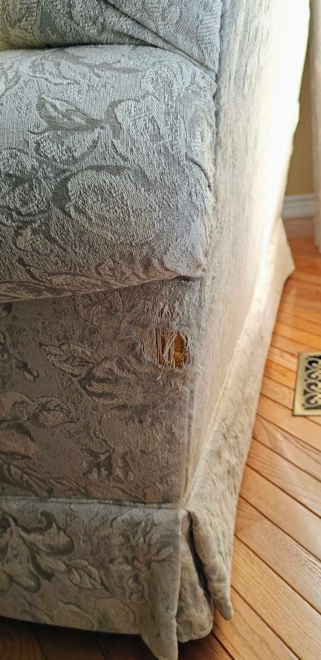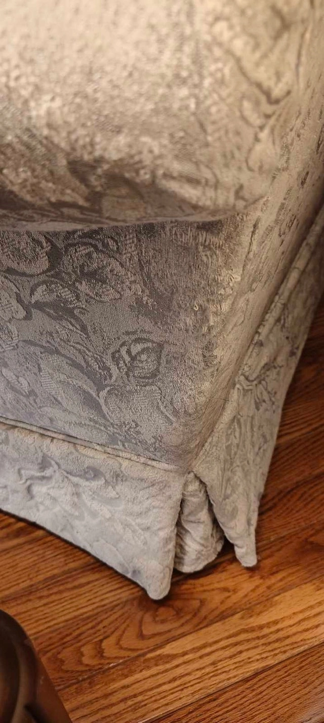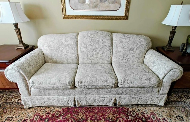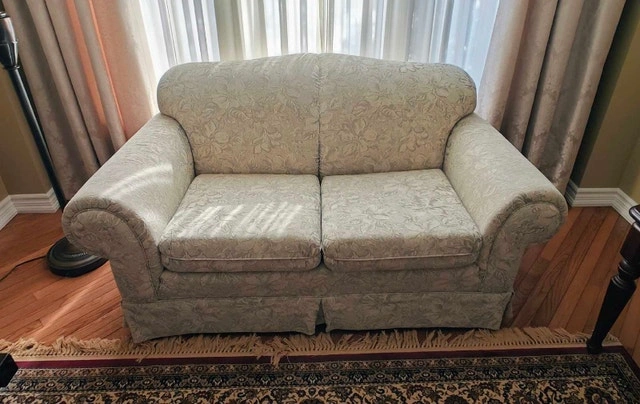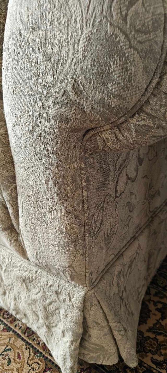 This gently used, high-end Sklar Peppler sofa and loveseat set is in good condition. It was rarely used as it was kept in a living room, so the foam is still firm and the material is in great shape.