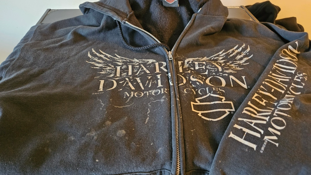 Men's black Harley Davidson zip-up hoodie. Features a faded graphic print of the Harley Davidson logo with wings. Shows some wear.