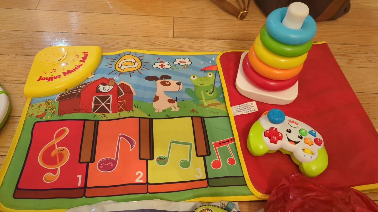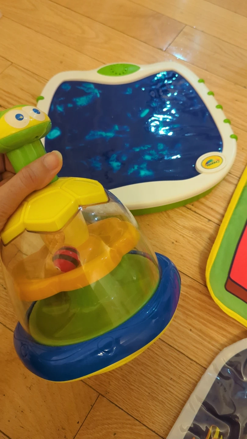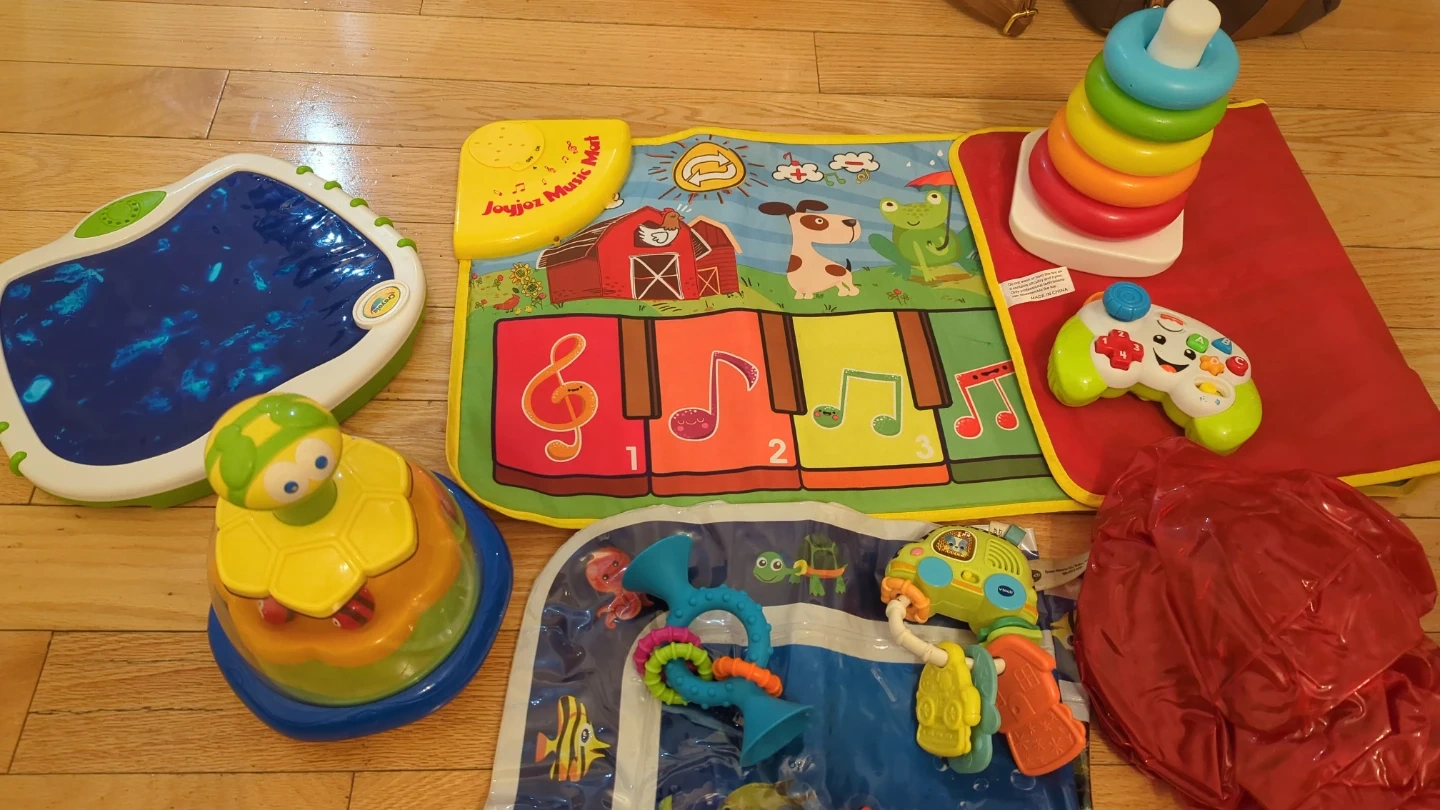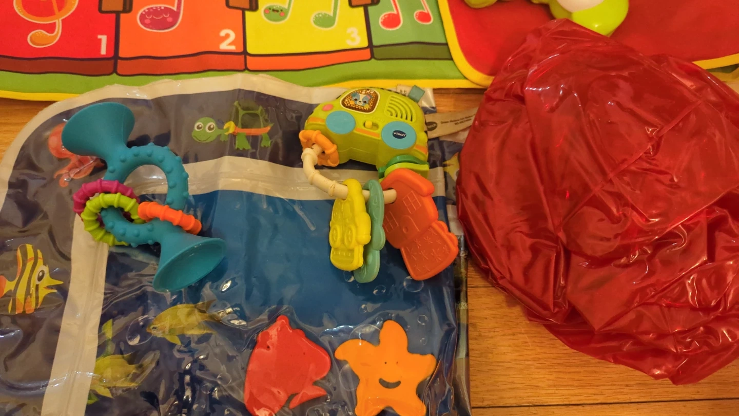 Includes a Fisher-Price piano mat, a VTech learning toy, and a Crayola water drawing mat. Also comes with a stacking ring toy, water mat for tummy times, red floating seat for swim days and a spinning toy. Great for little ones to explore and play!