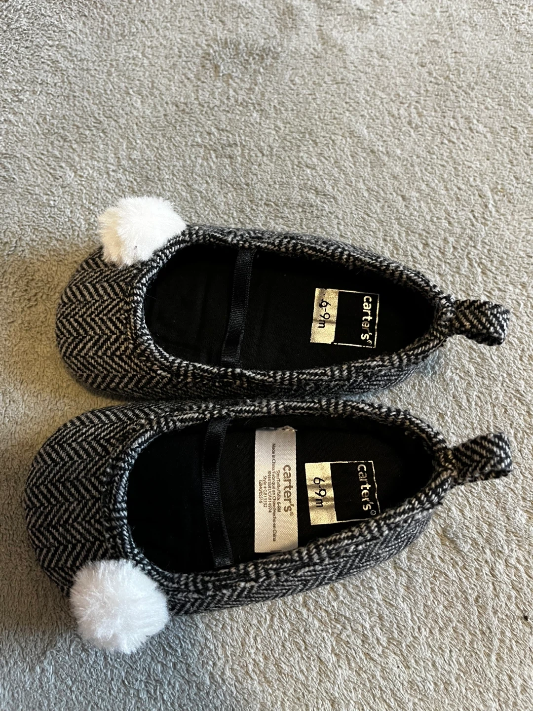 Brand new! They are size 6-9 months and feature a cute black and white herringbone pattern with a fluffy white pom-pom detail.