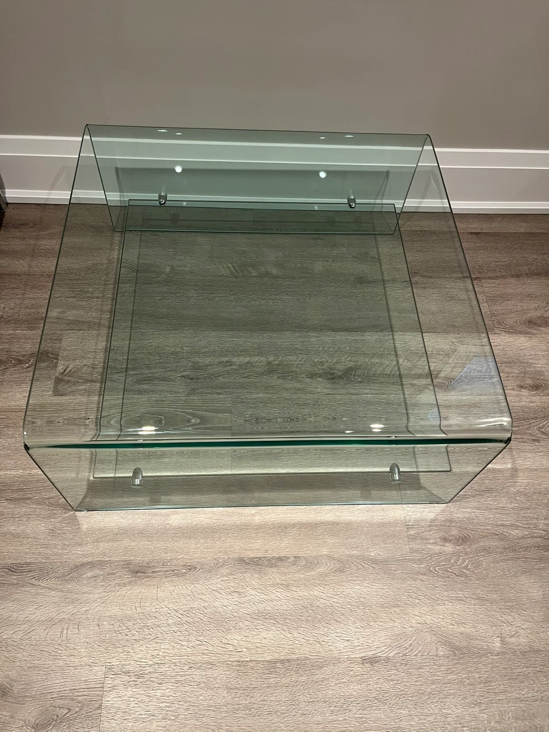 Sleek glass coffee table with a modern bent design (no sharp corners). It features two tiers for storage and display. Made entirely of clear glass.