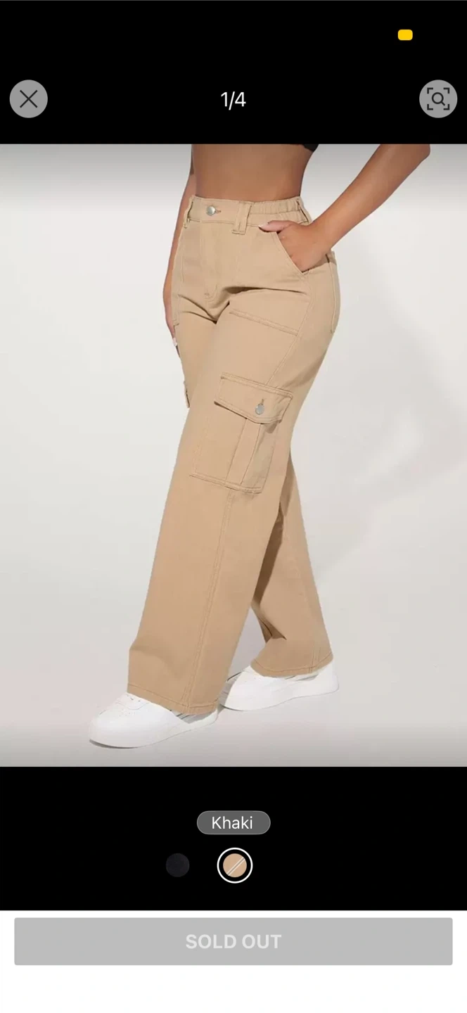 Comfortable khaki cargo pants with multiple pockets. These pants are made from a durable fabric. They're great for everyday wear.