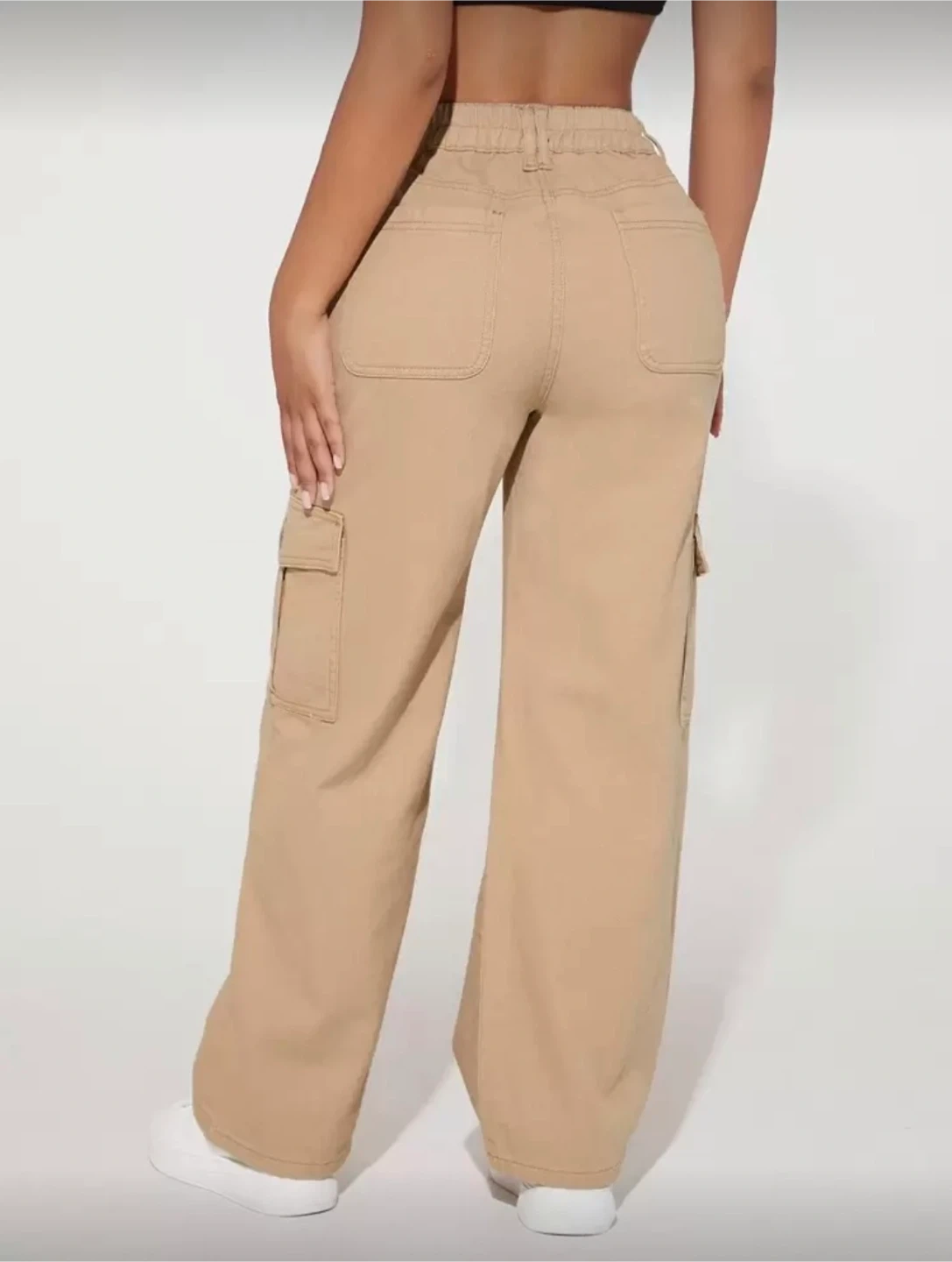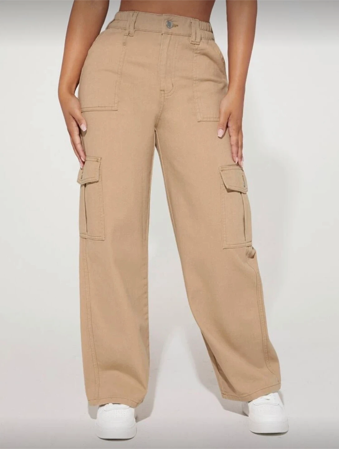 Comfortable khaki cargo pants with multiple pockets. These pants are made from a durable fabric. They're great for everyday wear.