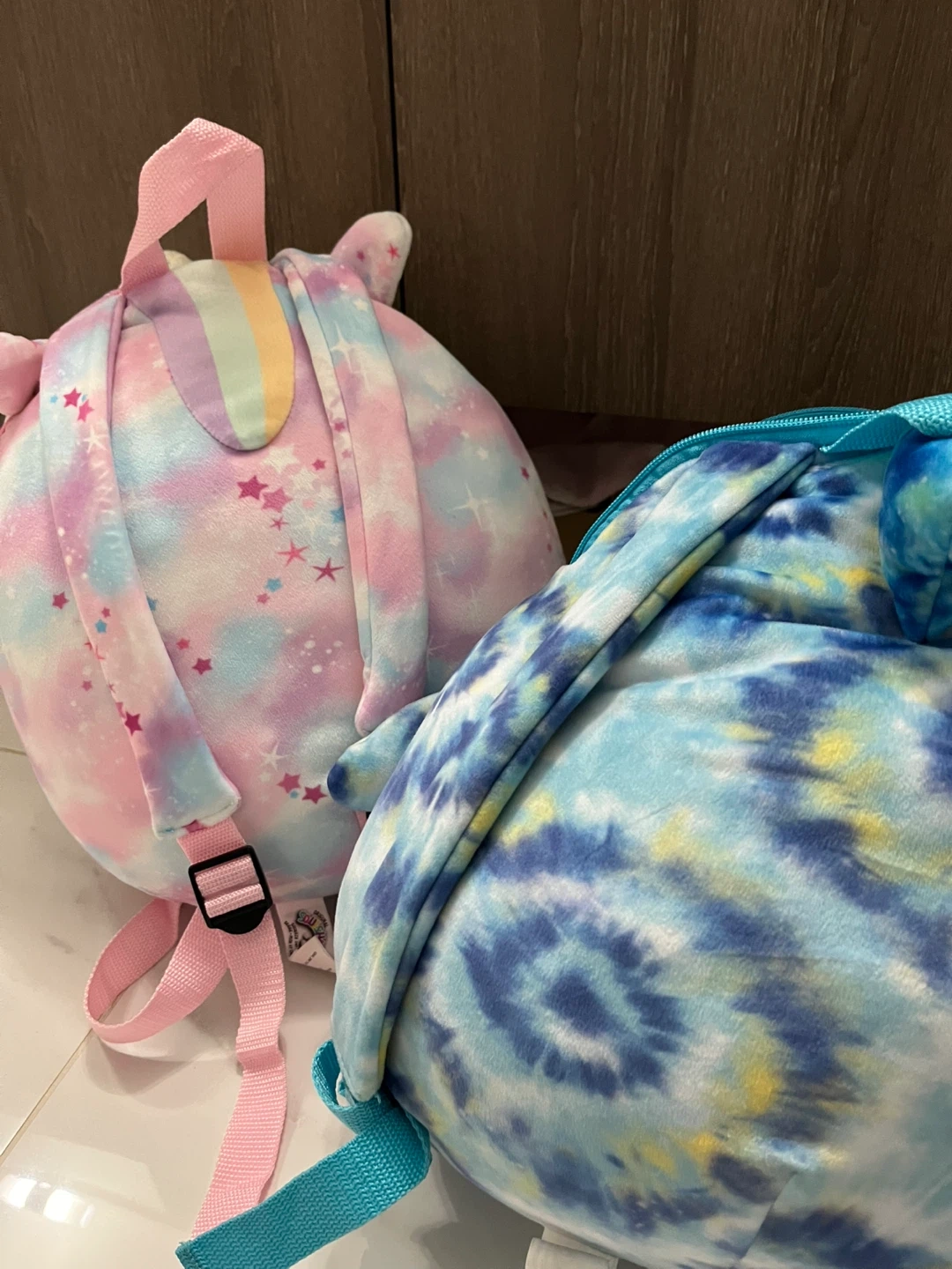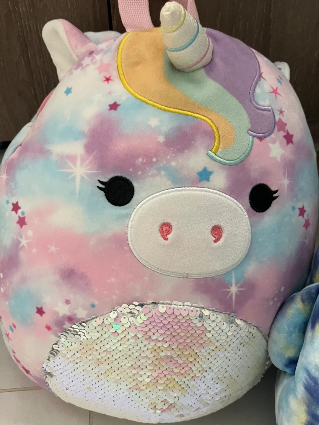 This Squishmallows backpack features a fun tie-dye shark design. It's made from soft plush material and has adjustable straps. It's perfect for carrying small essentials.