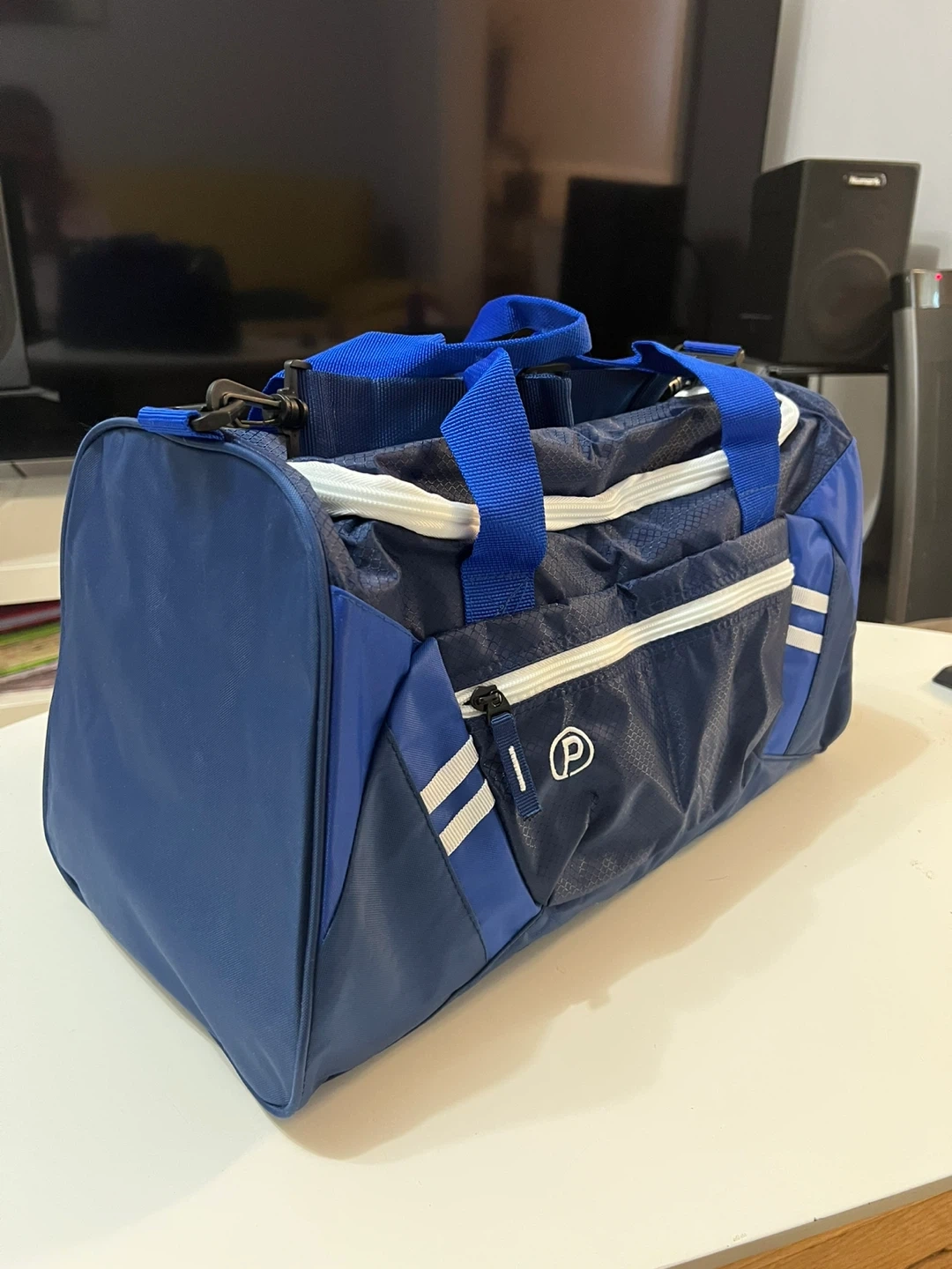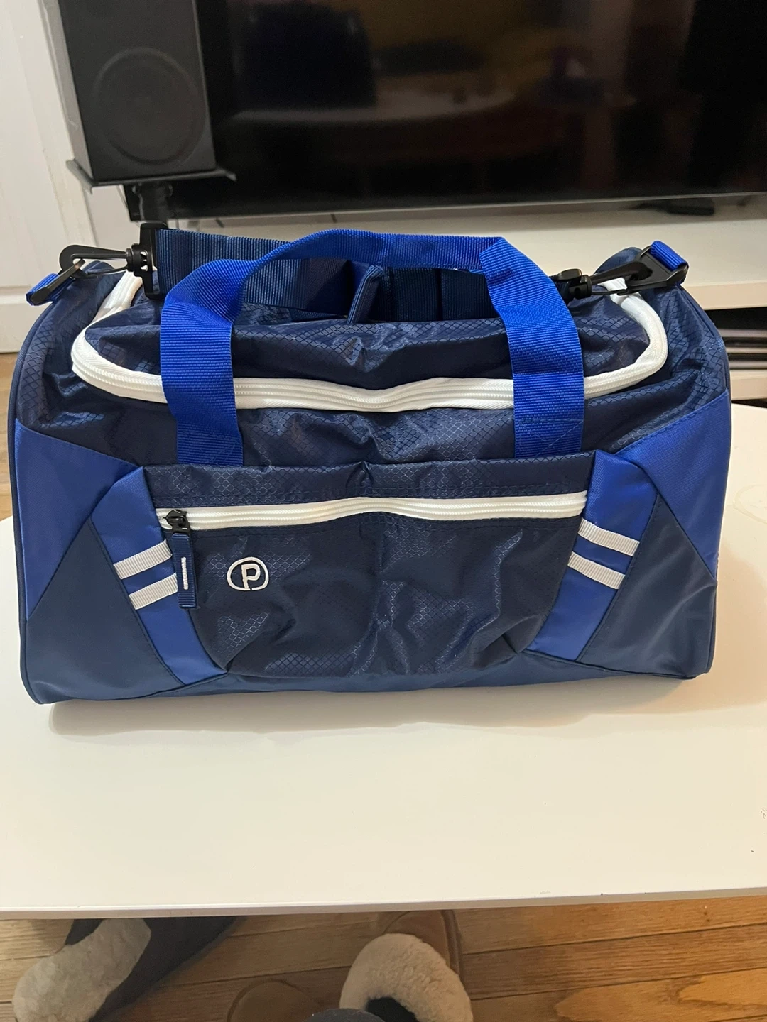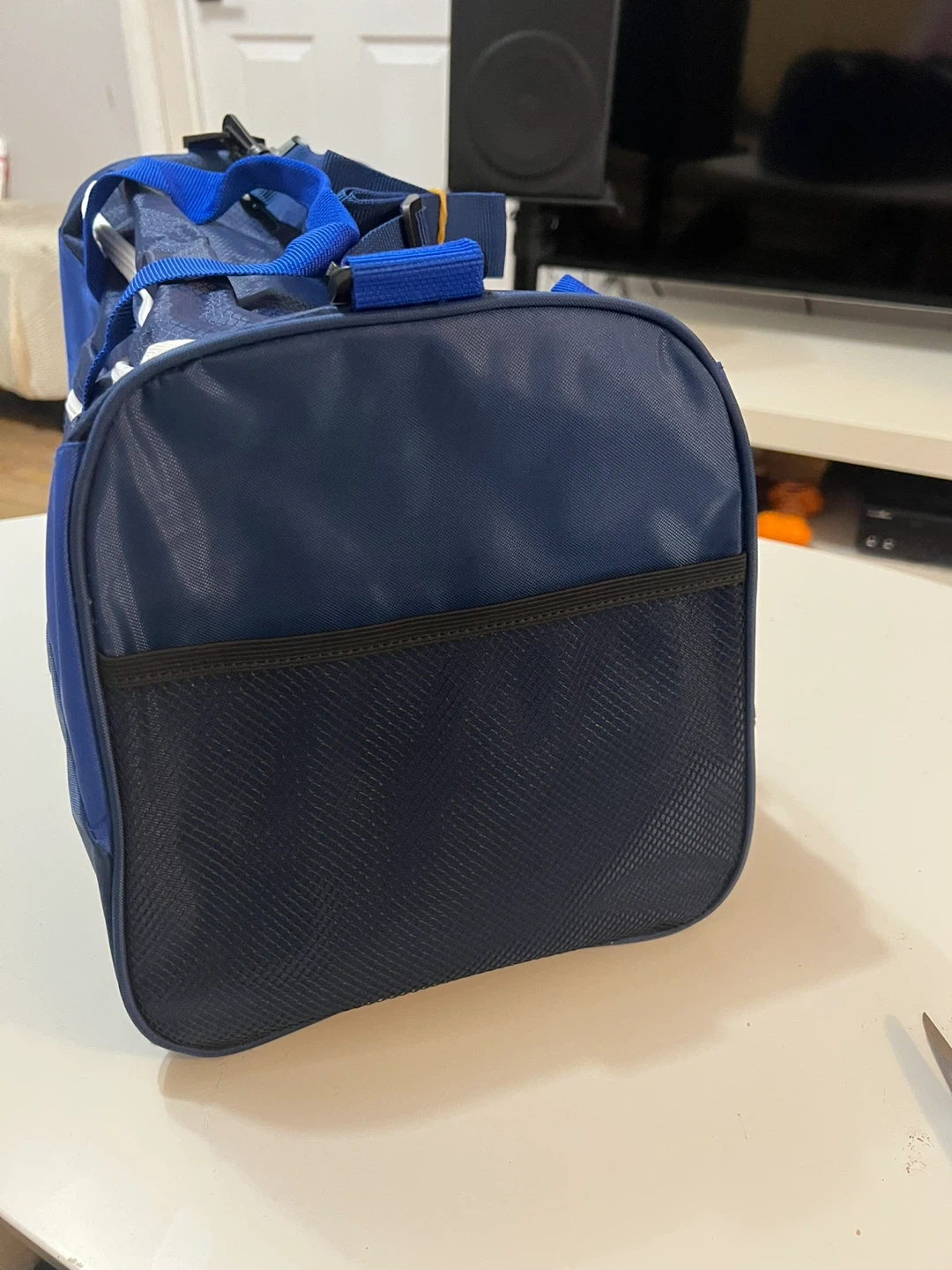Its not a branded one but I haven’t use it, Its basically new. A versatile blue duffel bag with a zippered front pocket and mesh side pocket. It has dual handles and an adjustable shoulder strap.