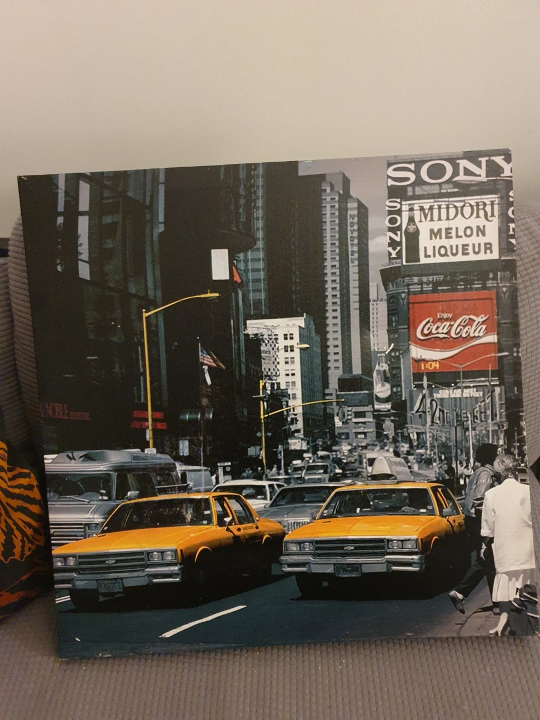 This wall art captures a busy street scene in New York City. It features yellow taxis and iconic billboards. Great for adding a touch of urban flair to your space!