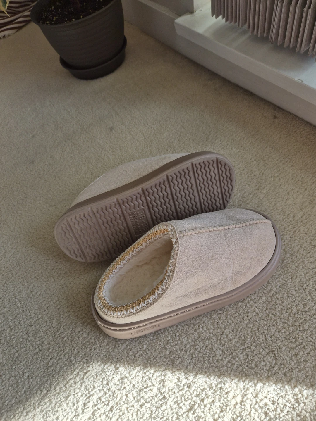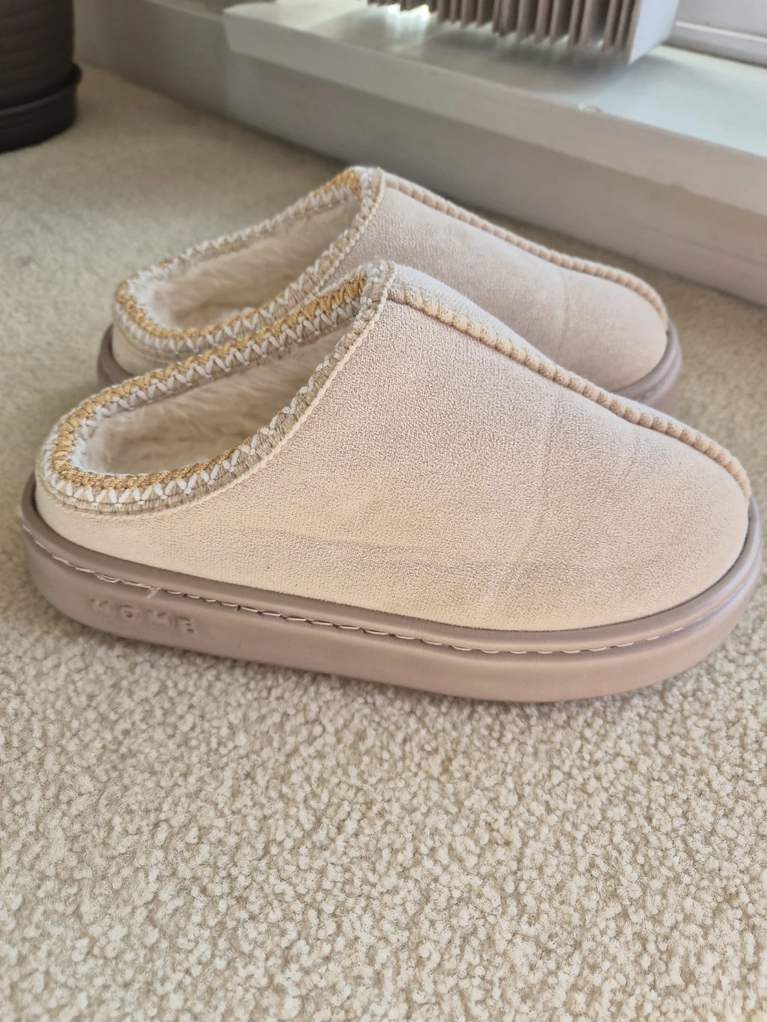 Cozy MUK LUKS slippers in a light tan/Baige colour.