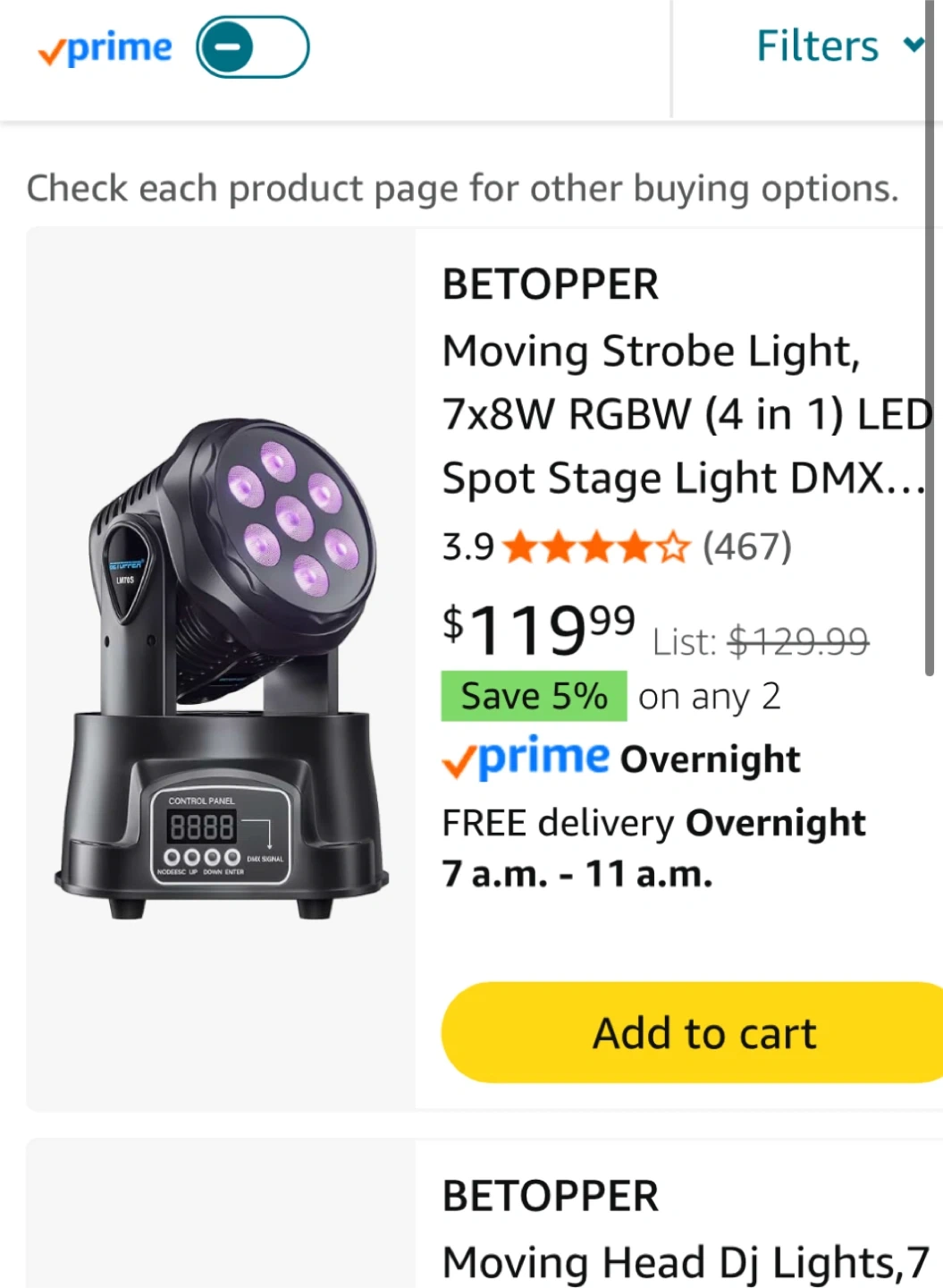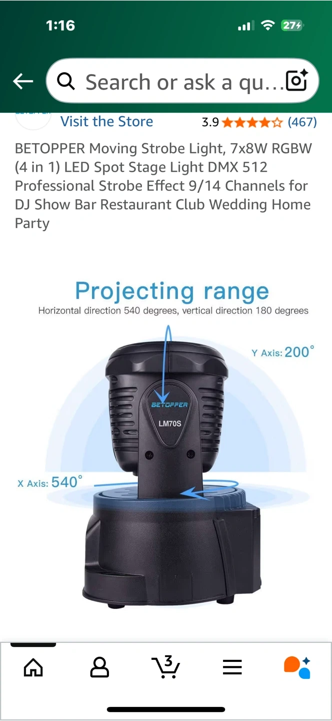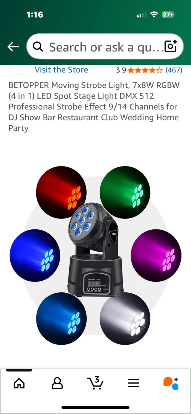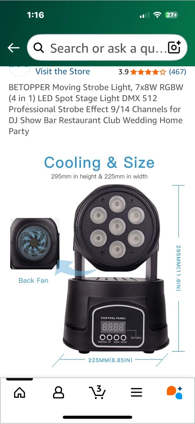 Selling a BETOPPER moving strobe light! It's a 7x8W RGBW (4 in 1) LED spot stage light. This light is perfect for DJ shows, bars, restaurants, clubs, weddings, and home parties. The dimensions are 295mm in height and 225mm in width.