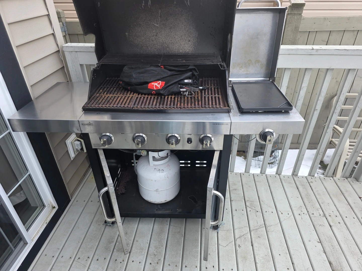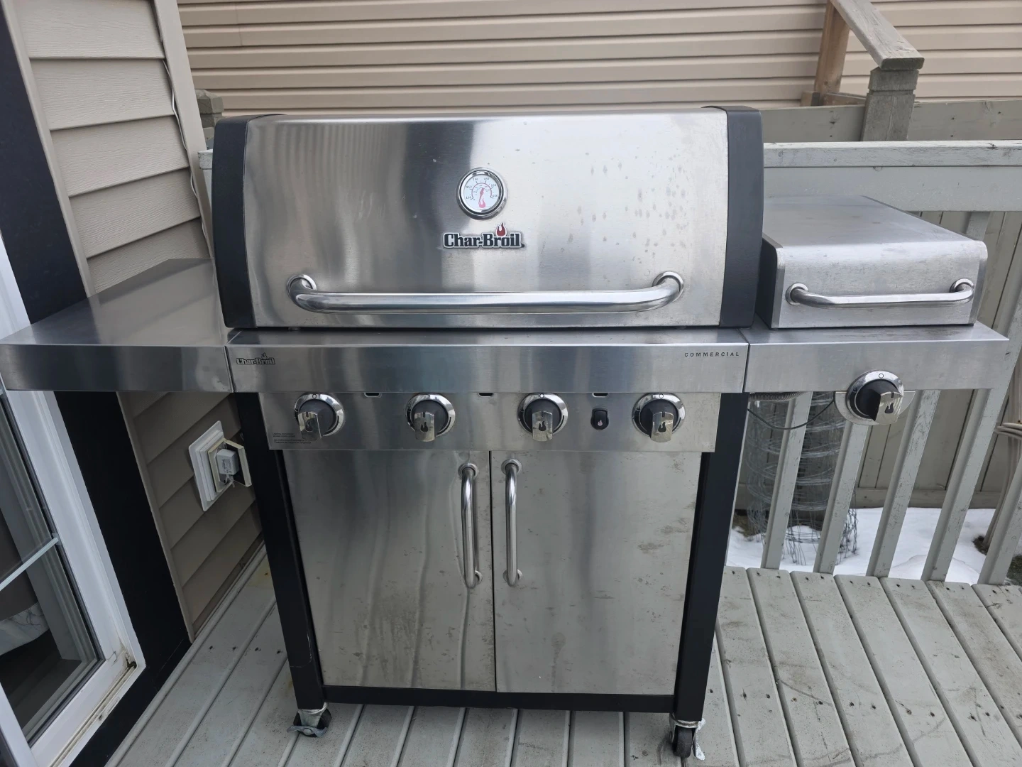 This Char-Broil Commercial gas grill features four main burners and a side burner. It's constructed with stainless steel components for durability. Great for backyard gatherings and outdoor cooking!