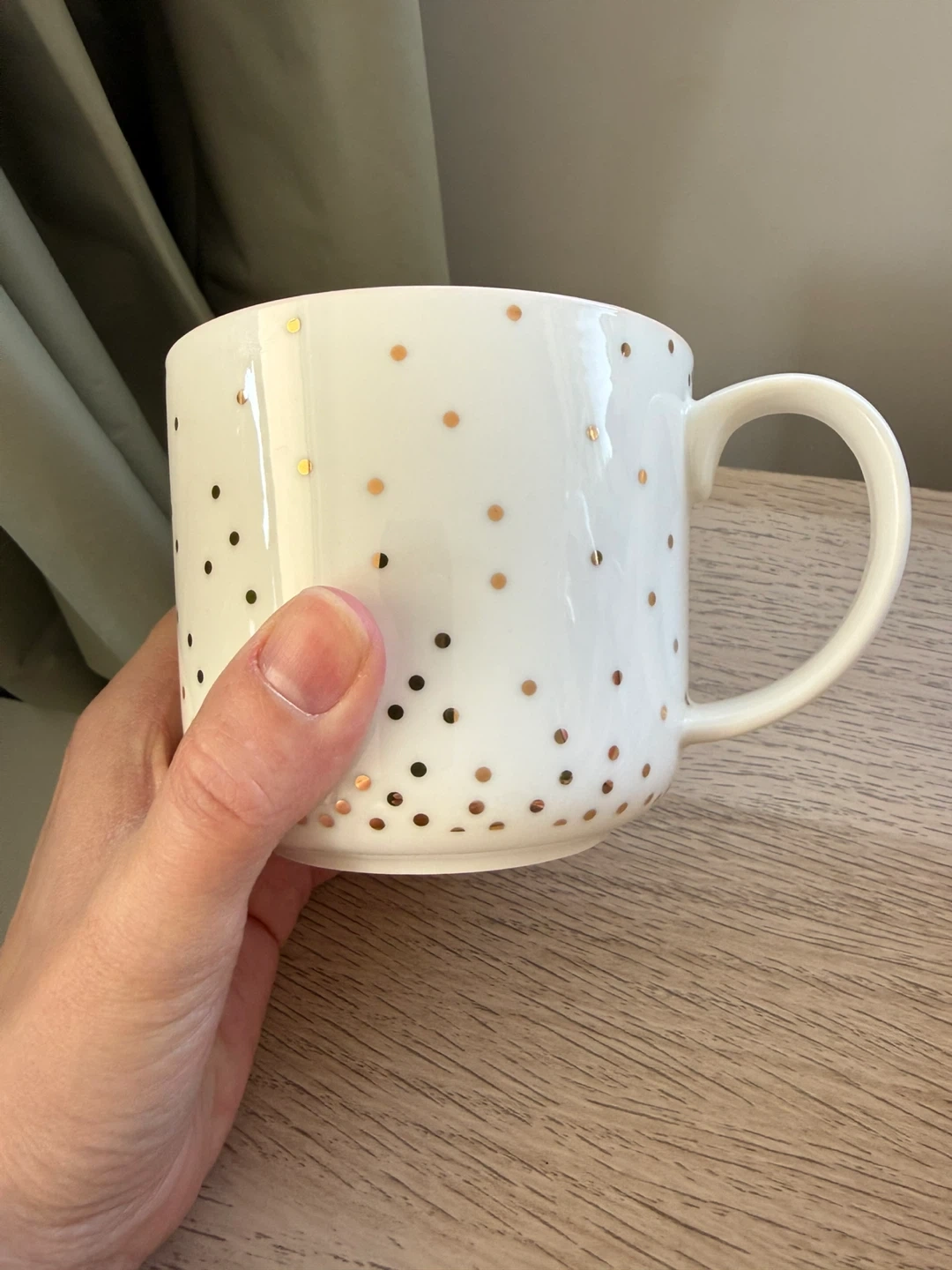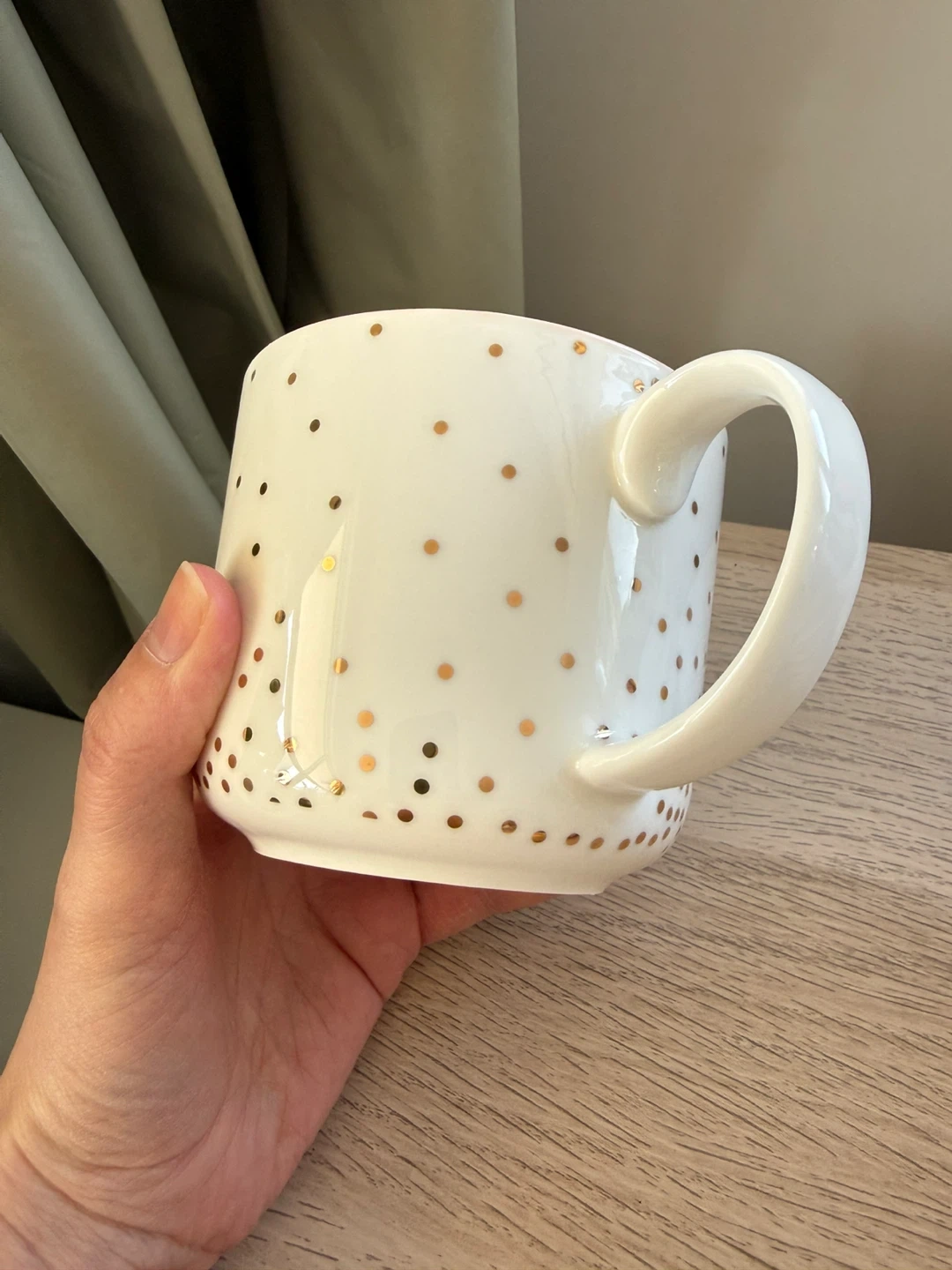 Metallic dots on outside of mug. (Do NOT microwave this mug because of the gold)