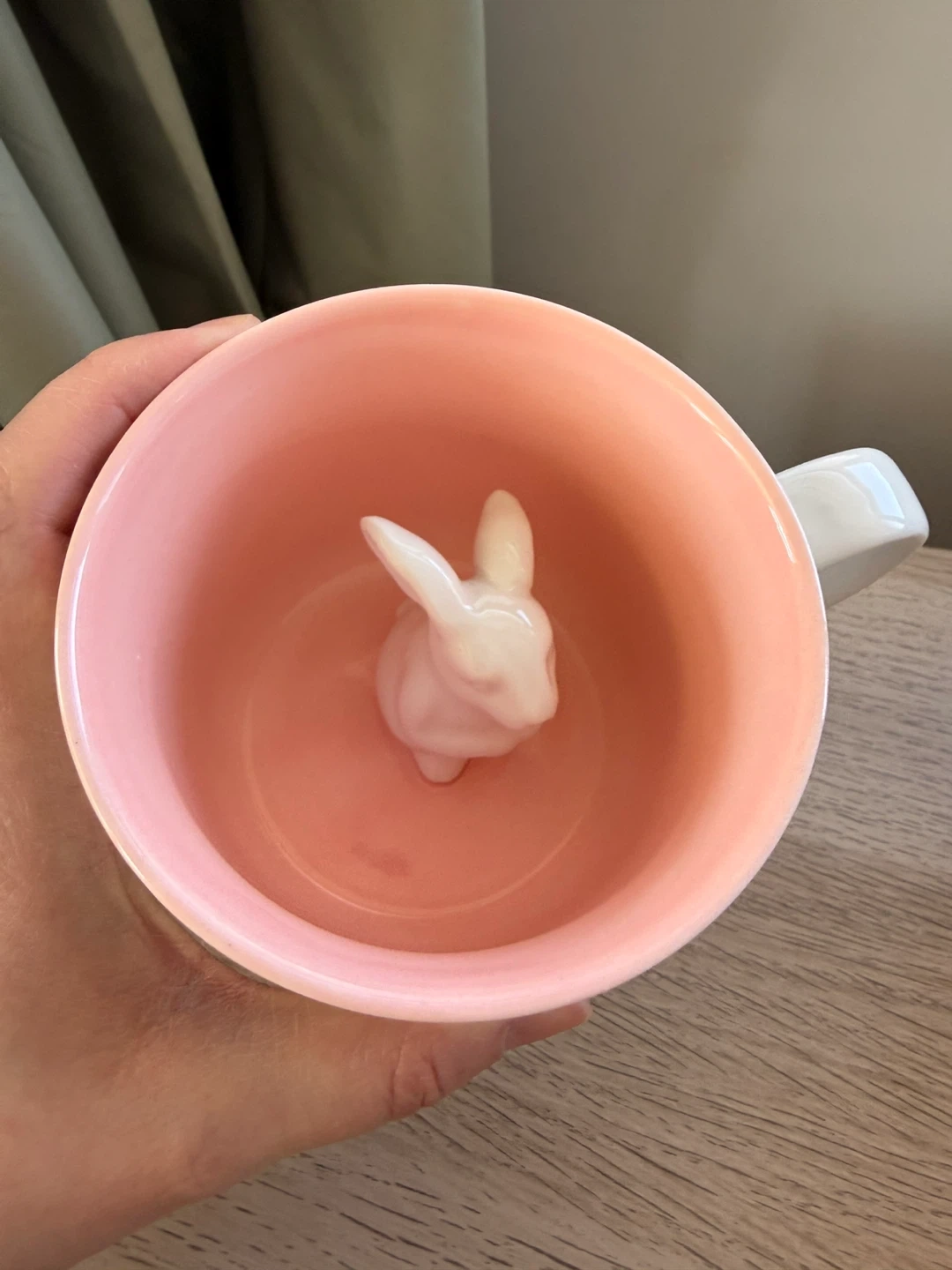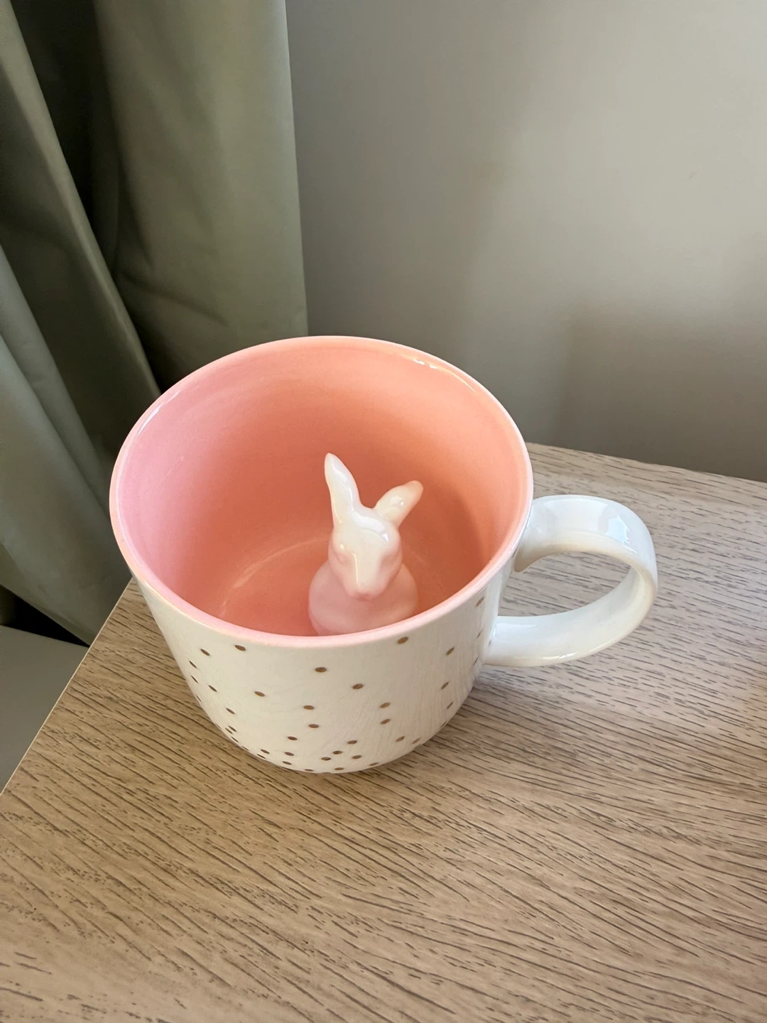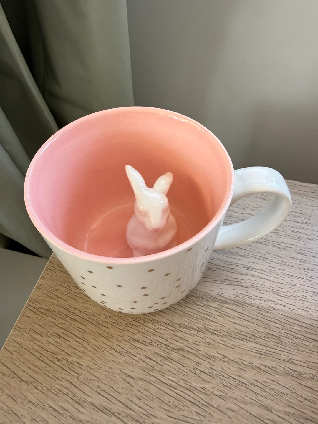 Very sweet little bunny mug! Features a cute white ceramic bunny inside the mug, and has gold