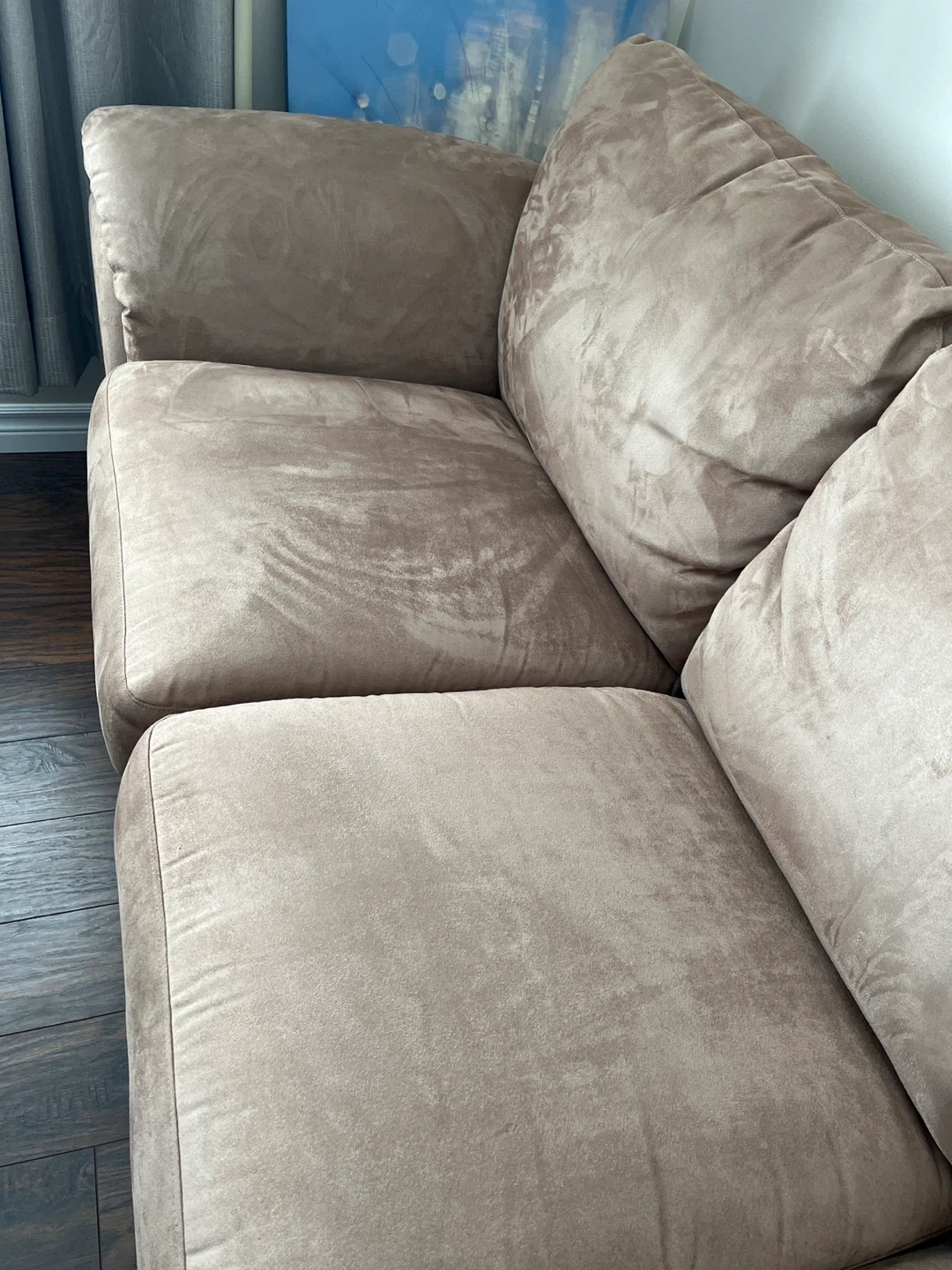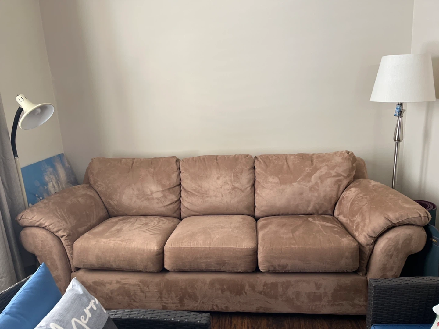 Comfortable 3-seater sofa with plush cushions. Upholstered in a soft tan suede-like fabric. Spacious seating for multiple people.