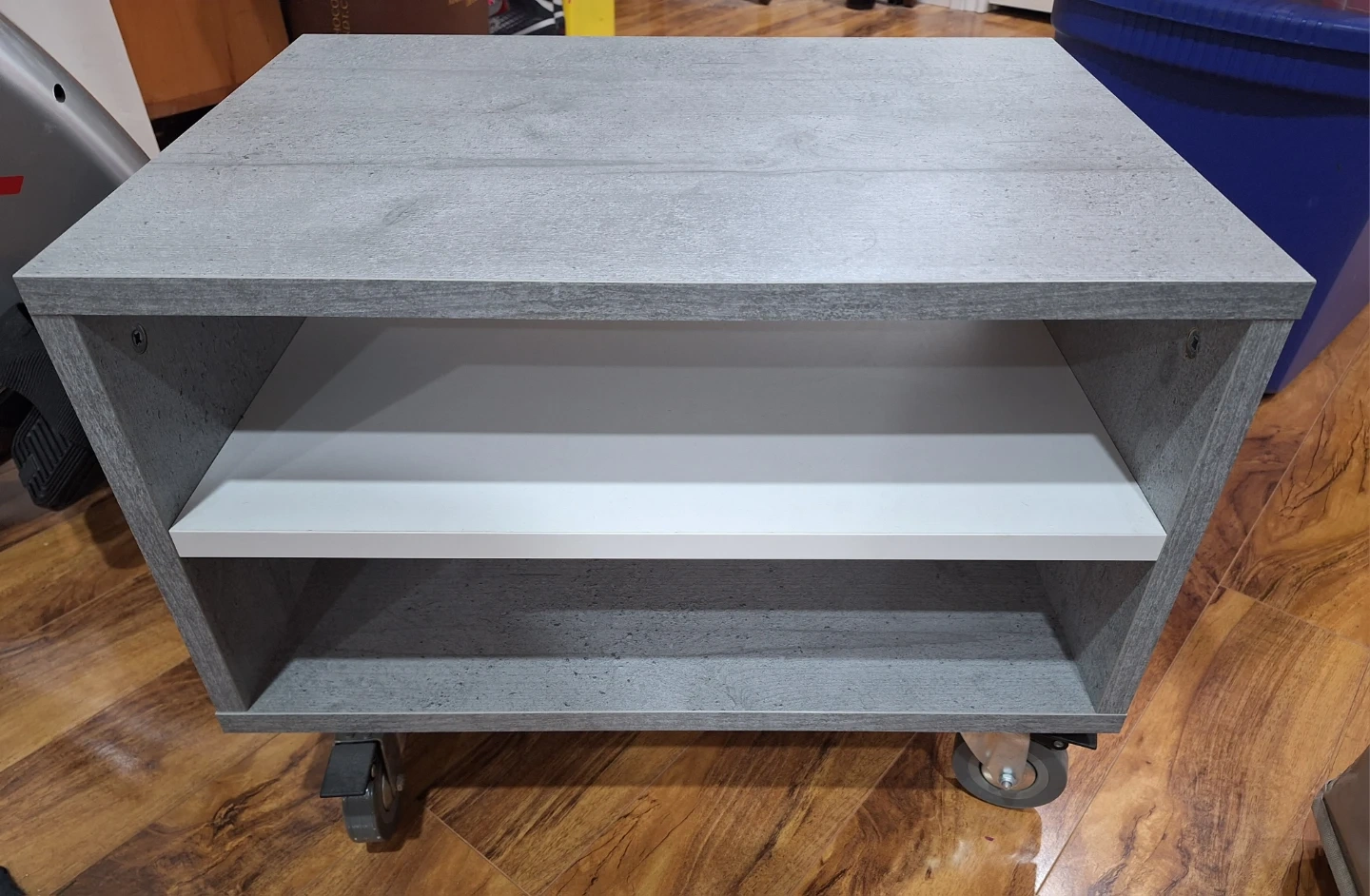 Selling a grey side table with wheels! It has a shelf for extra storage. Great for small spaces or as a nightstand