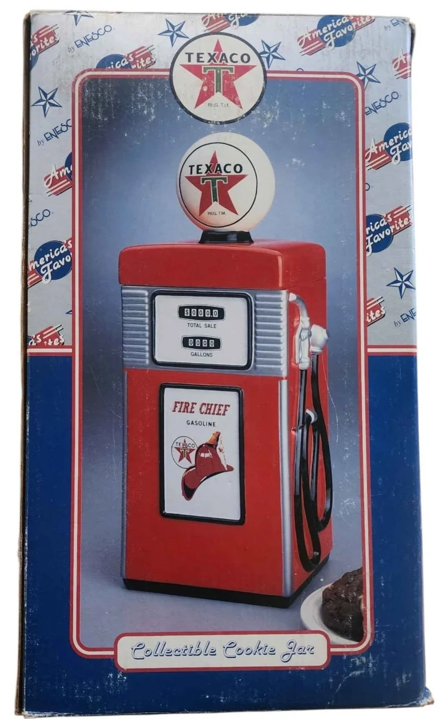 This is a Texaco Fire Chief gasoline collectible cookie jar. It's shaped like a vintage gas pump and features the iconic Texaco logo its hand painted and limited addition. This unique piece would be a fun addition to any collection or kitchen! This item is in beautiful unused condition more can provide more picture if needed.