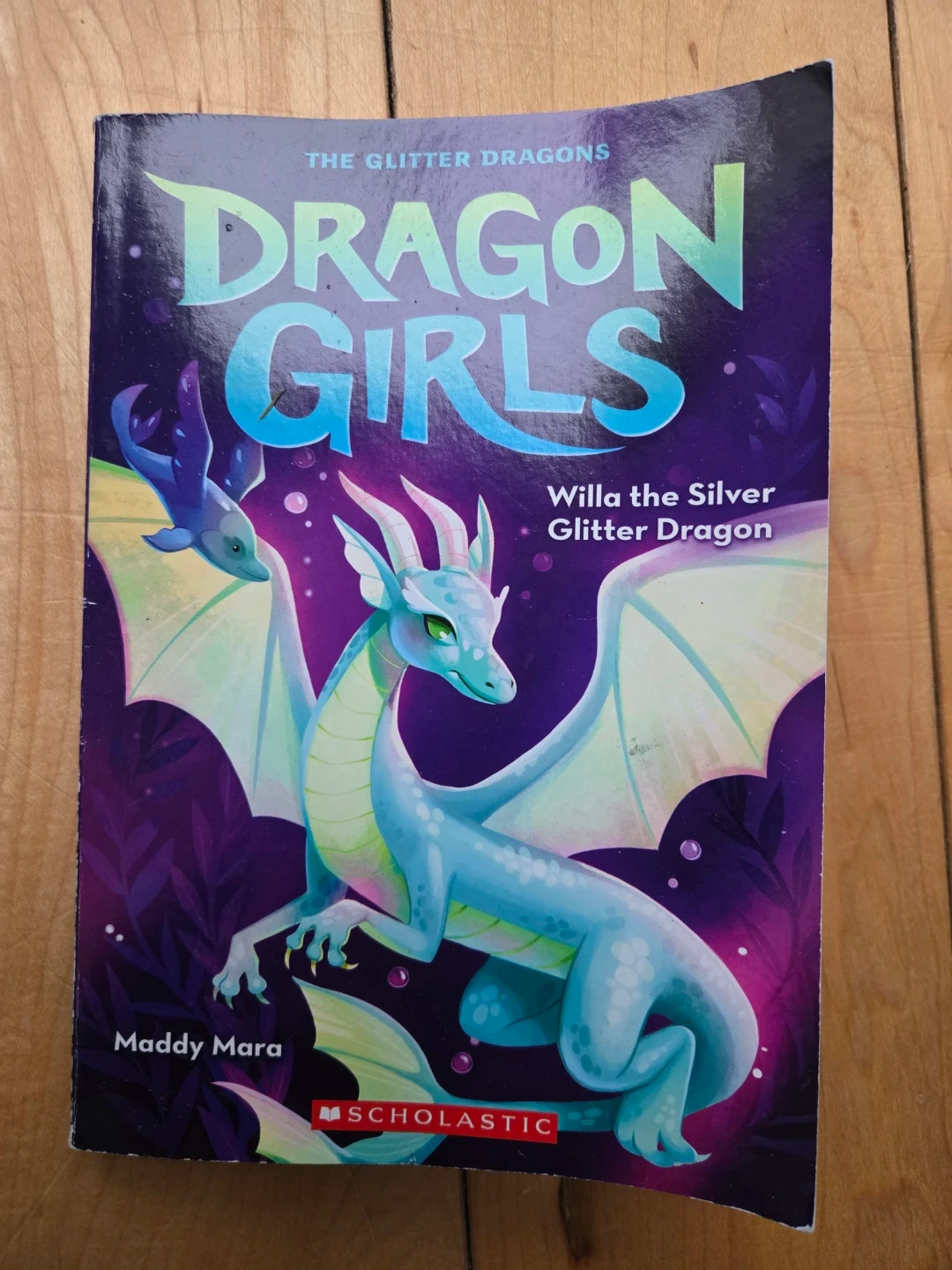 This is the book "Willa the Silver Glitter Dragon" from the Dragon Girls series. It's written by Maddy Mara and published by Scholastic. A fun read for young dragon lovers!