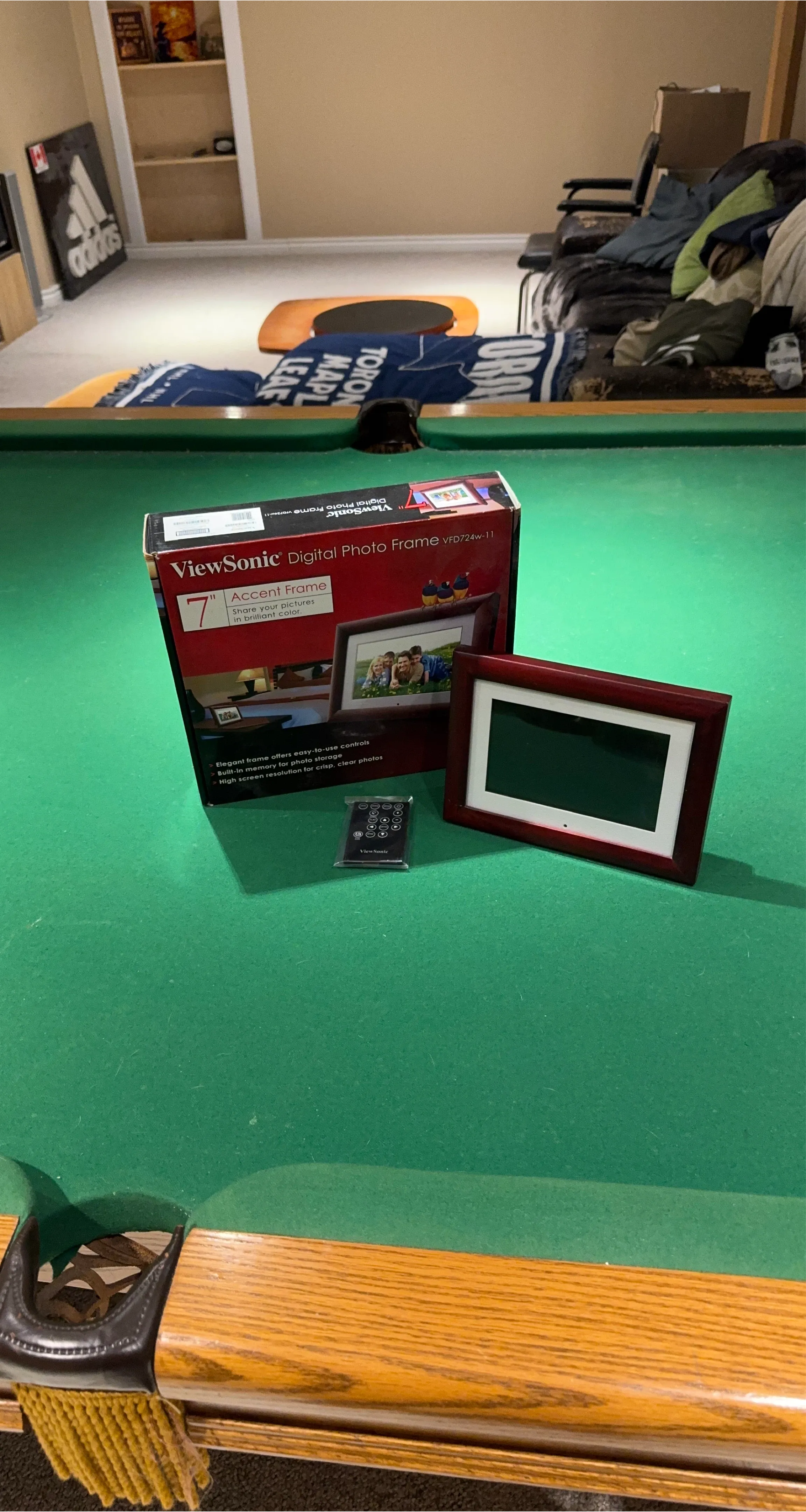 Selling a ViewSonic 7" digital photo frame. It comes with the original box and remote. The frame offers easy-to-use controls and built-in memory for photo storage. It also has high screen resolution for crisp, clear photos!