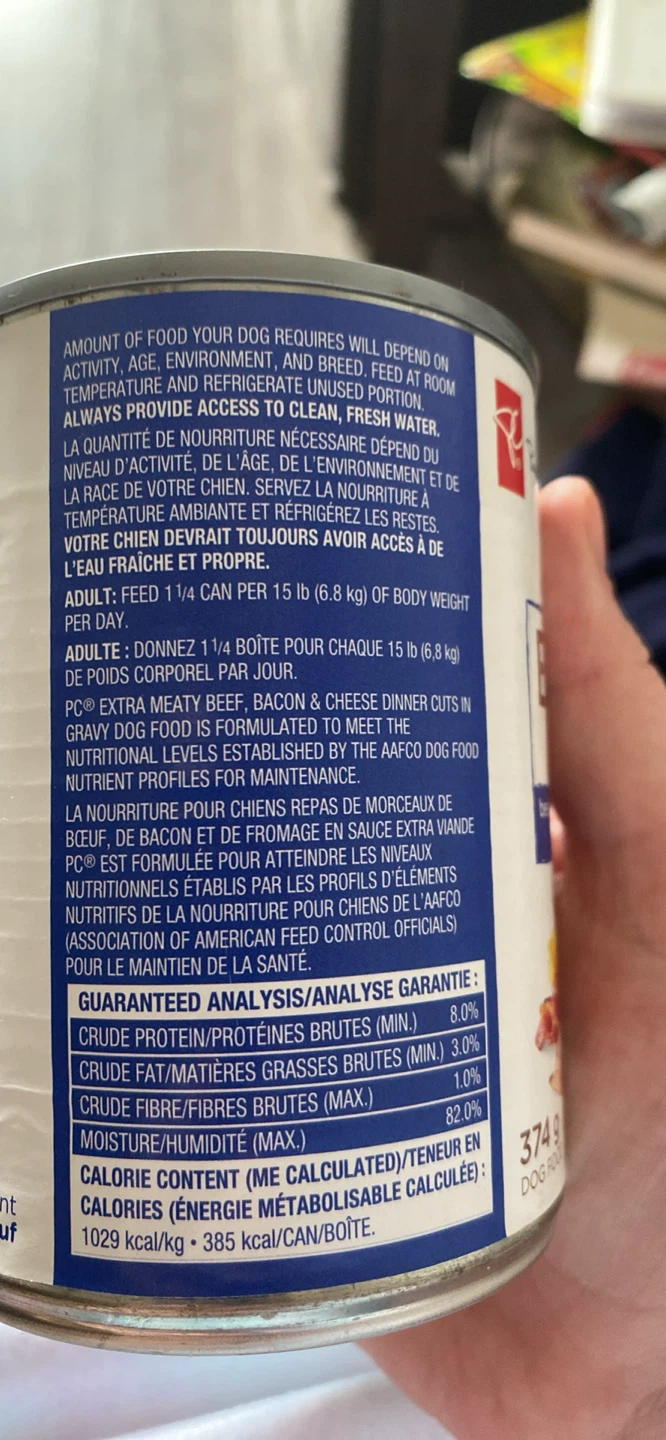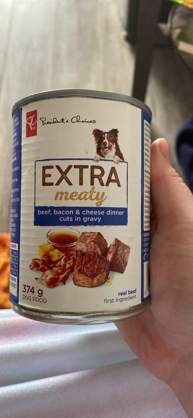 President's Choice Extra Meaty dog food with beef, bacon & cheese dinner cuts in gravy. Contains 374g of dog food. BB/MA 2026 MR 18.