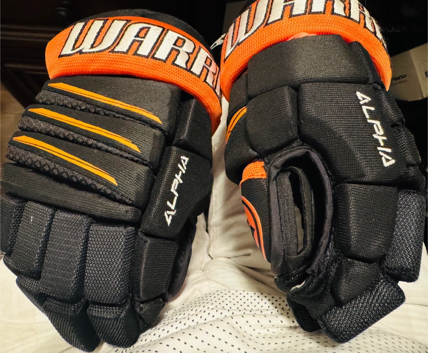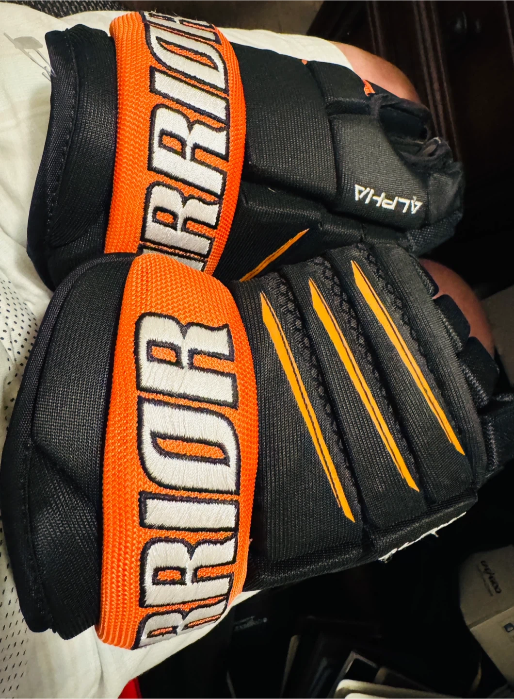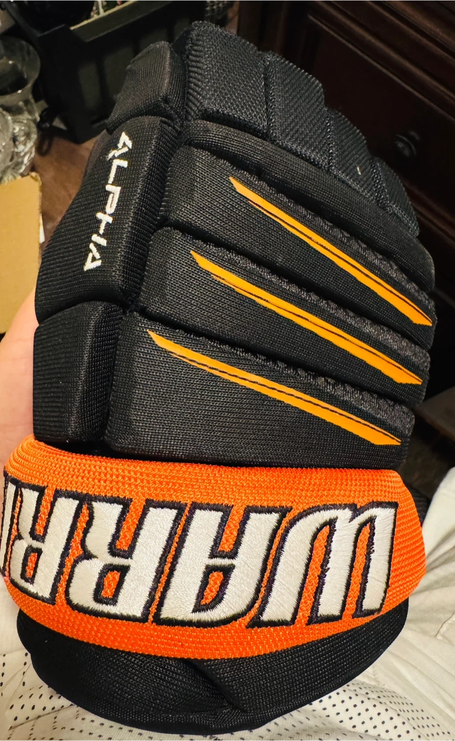 Warrior Alpha QX3 hockey gloves in black and orange. Size 11". These gloves offer good protection and mobility for the game. Made with a durable construction.