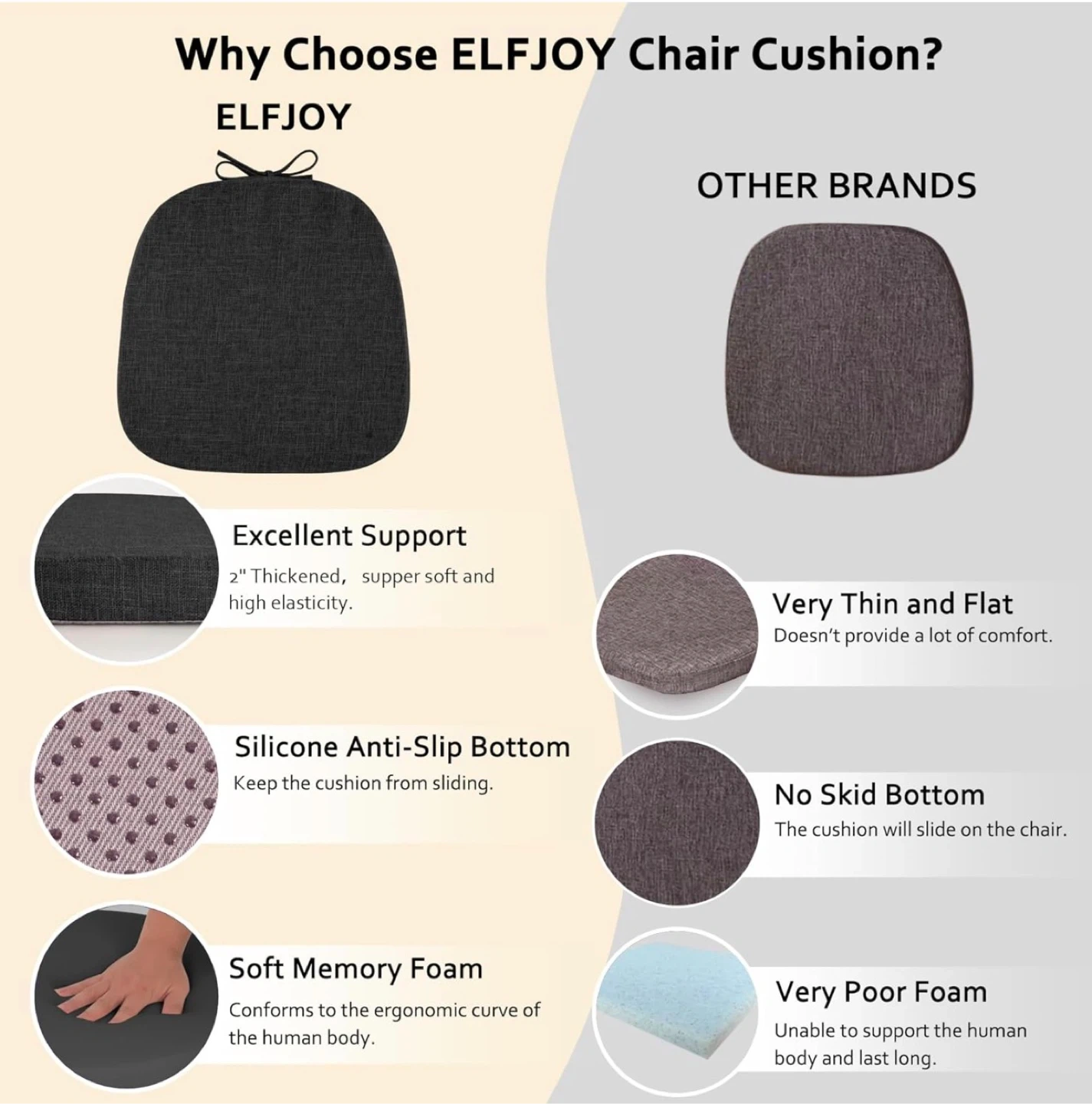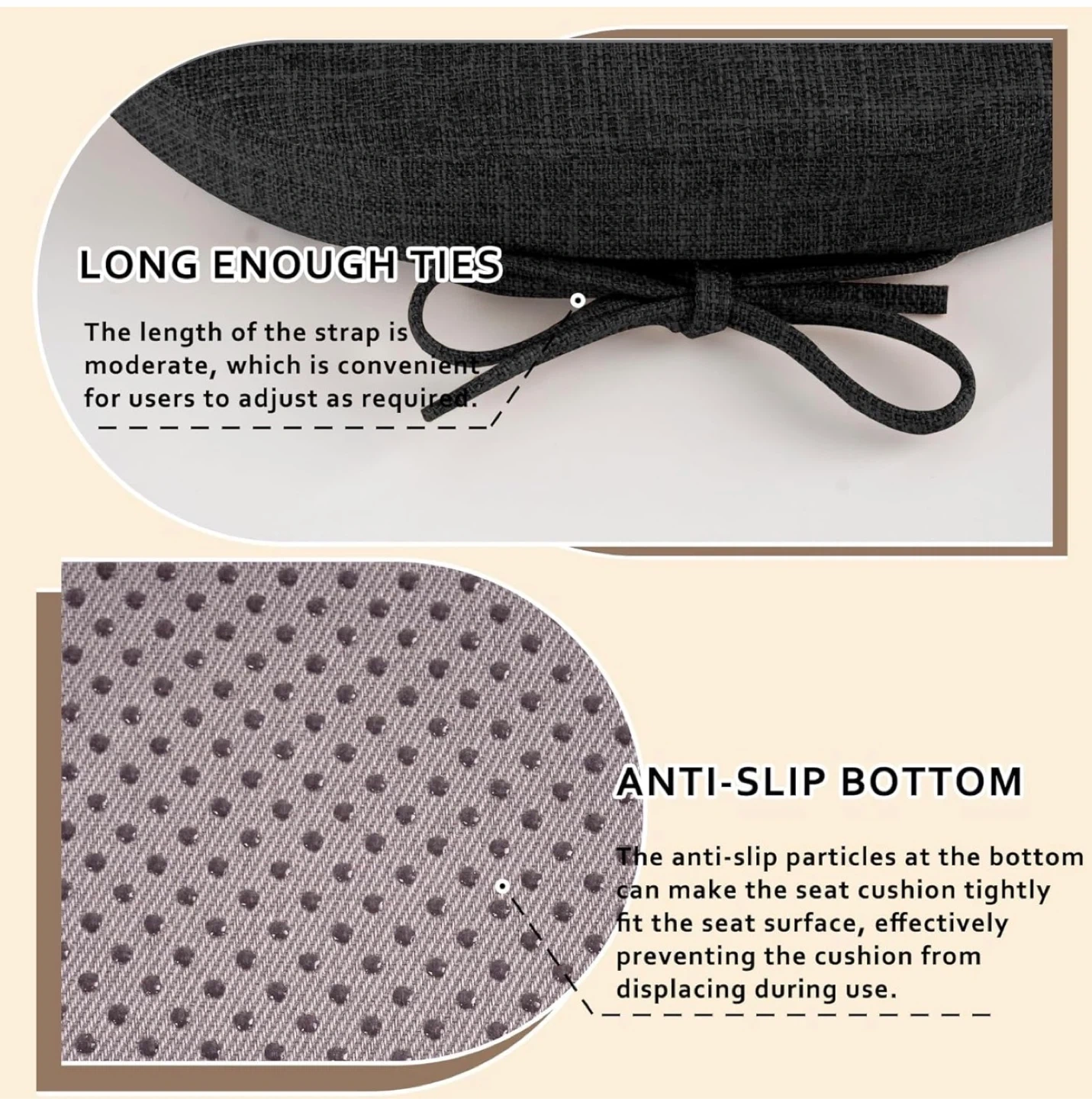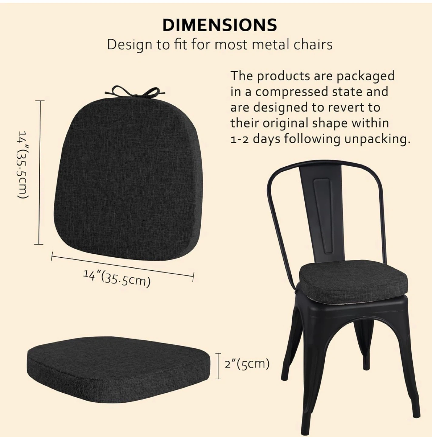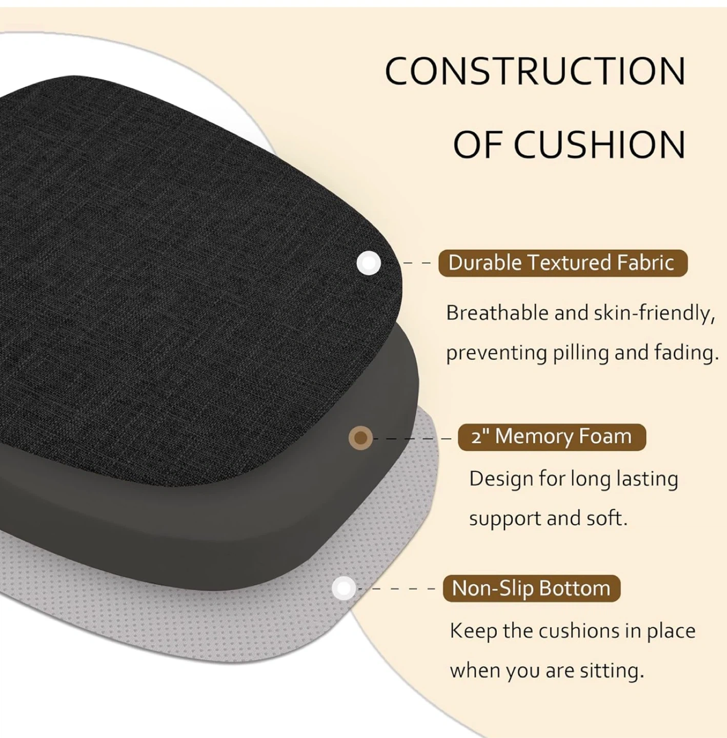 These chair cushions are made with a durable, textured fabric and 2" memory foam for comfort. They feature a non-slip bottom and long ties to keep them in place. The covers are removable and washable.