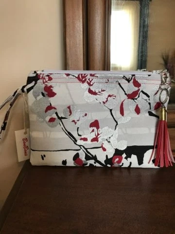 Stylish BooBoon wristlet clutch purse with a vibrant pattern. It's 9" wide and 6 1/2" deep. Great for carrying essentials on the go!