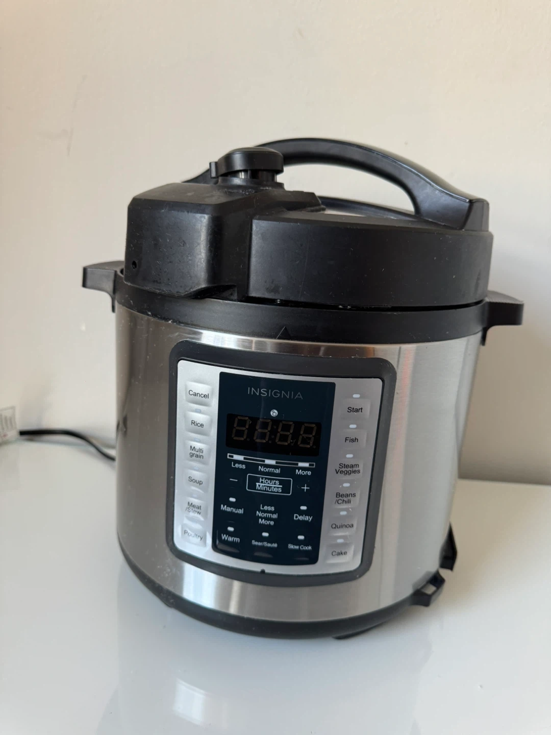 Selling an Insignia pressure cooker with a 4L capacity! It's in great shape and ready for a new kitchen. Perfect for quick and easy meals like rice, soup, or even cake! It has settings for multi-grain, normal, and more, as well as functions for steam, beans, and quinoa